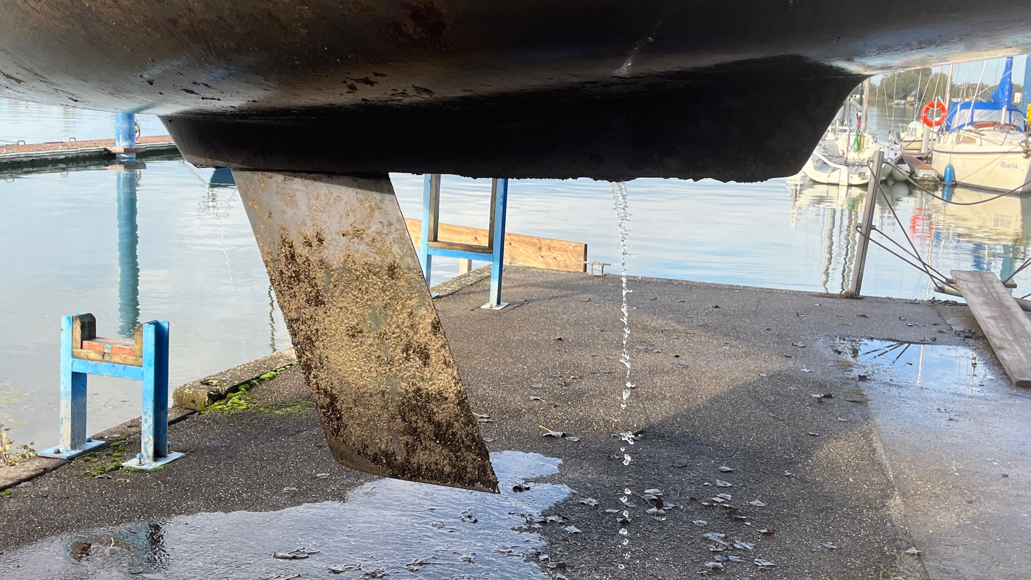 Auch bei mehrfachen Versuchen und nicht bei seitlichem Ansetzen ans Brett. Keine Chance. Hinsichtlich des Kurbelns an Deck am Antrieb der Hubkielspindel gab es keine Änderung. Wir haben das Schiff dann notgedrungen zurück ins Wasser gekrant und müssen nun gucken, wie es weitergeht. Rein optisch stand der Kiel nicht komisch oder asymetrisch heraus. Sehr seltsam, dass alles so klemmt, dass das Bootsgewicht überhaupt nicht ausrichten kann...