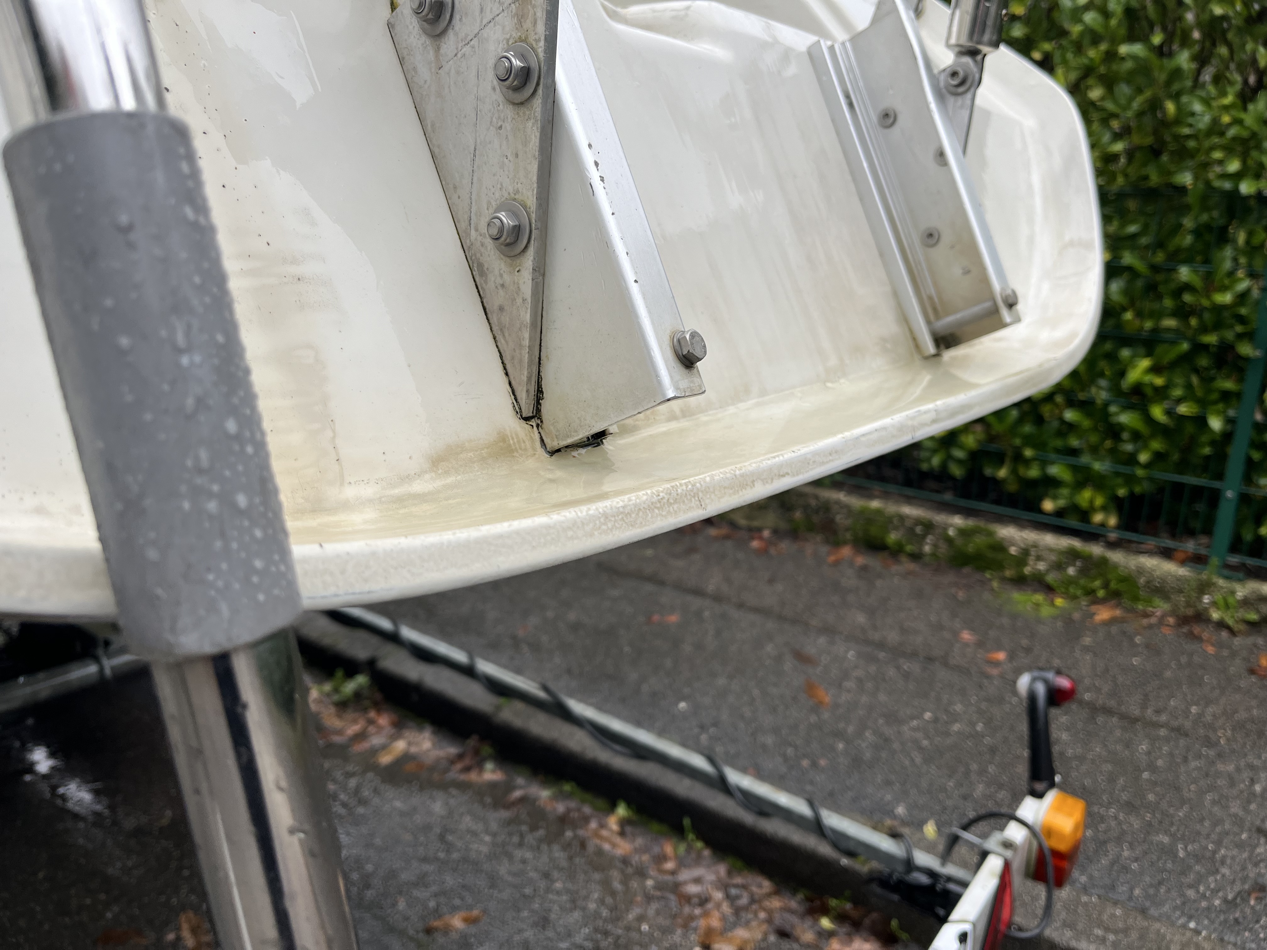 Wie ihr in dem Bild sehen könnt, steht auf der "Abrisskante" hinten bei meiner Dehlya 22 gerne mal Wasser. Das kommt vom Deck oder aus dem Cockpit runter oder schwappt aus dem neckar oder anderem Gewässer rein. Wenn meine Frau und ich segelen und hinten sitzen sowieso. Aber auch wenn das Boot am Steg liegt und auch wenn es auf dem Hänger ohne Persenning steht. Im Fall am Steg steht dort also Neckarwasser (oder Ostseewasser in Zukunft) und läuft nicht ab. Es reicherts sich dort durch Verdunstung eine grüne Suppe an.
