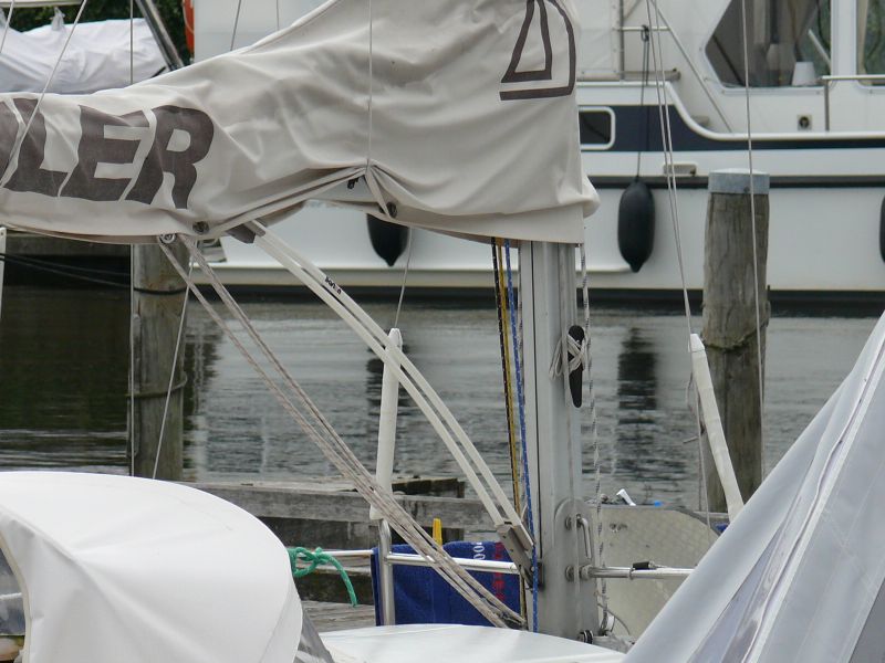 Die Stäbe lassen sich in Grenzen kürzen, allerdings habe ich meine nicht gekürzt. Für die Befestigung in der Mastnut wird in Gegenstück mitgeliefert, dass in die Nut eingeführt wird. Ich benutze das nicht, weil der Fuß des Kickers dann etwa 20 cm höher sitzt müsste, um beim Mastlegen nicht gegen den Koker zustoßen.