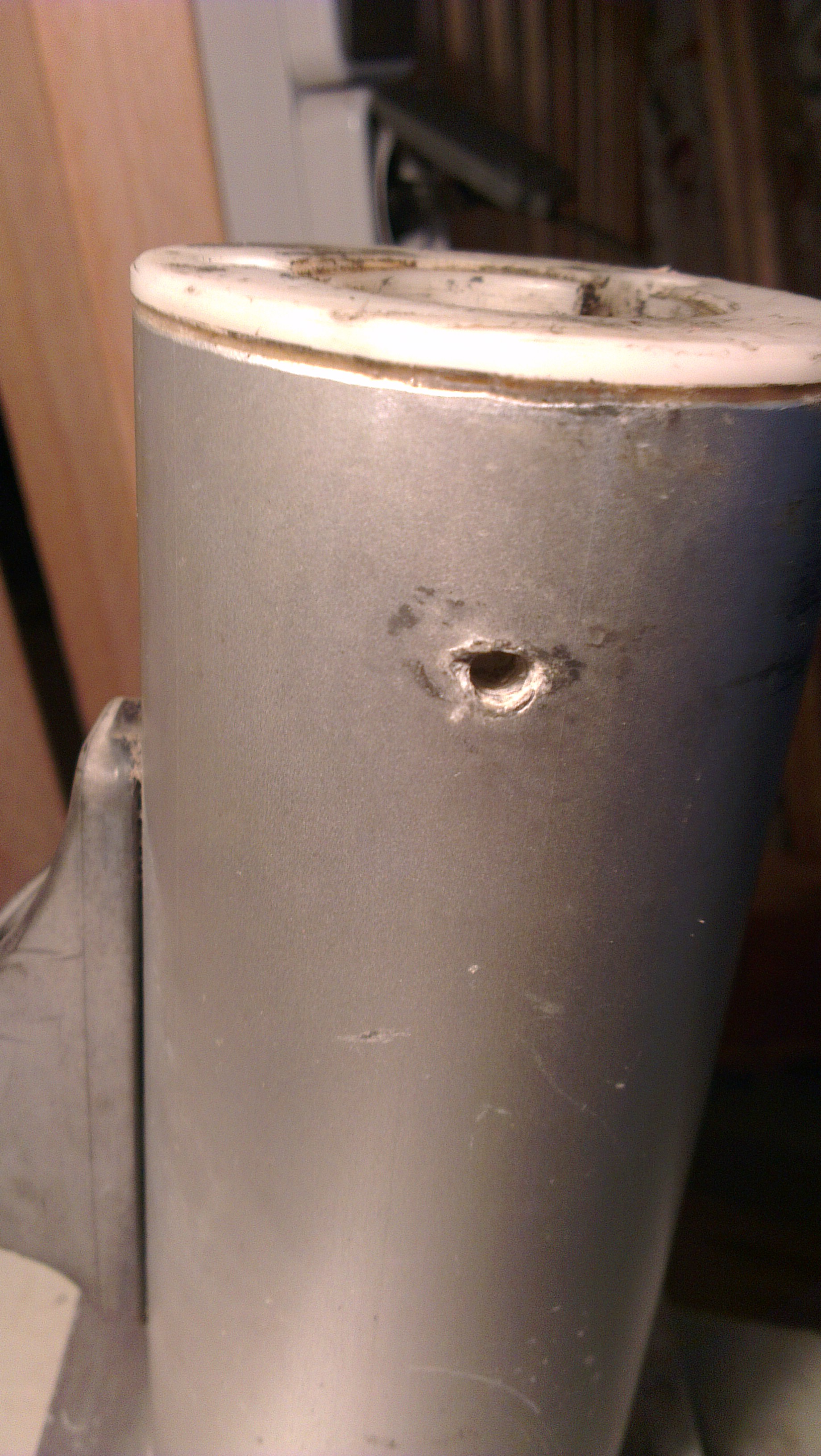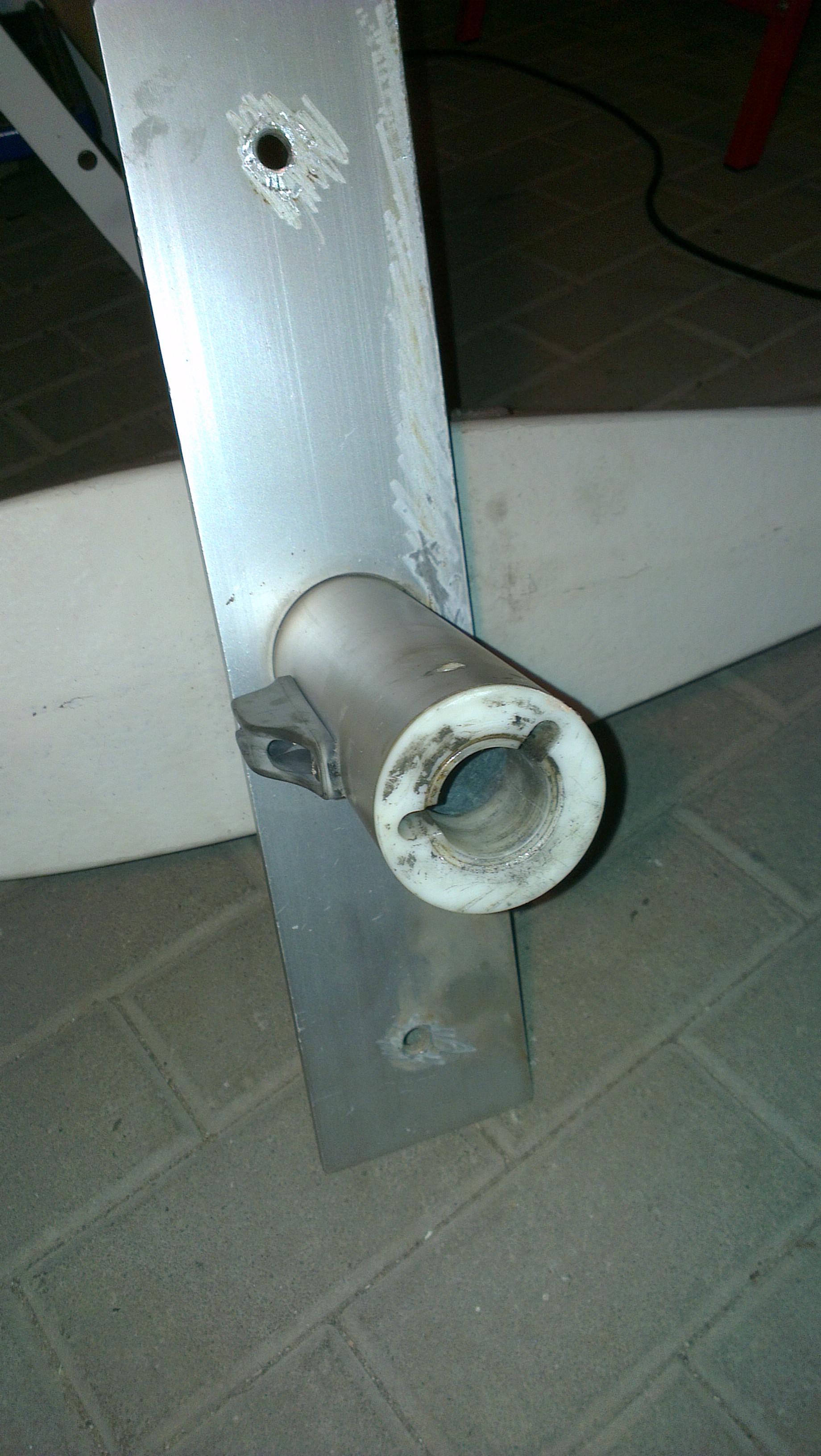 Immerhin: Die Ruderlager sehen noch gut aus, es gibt keine sichtbaren Abschleifungen. Nur frage ich mich, was es mit den drei Löchern in der äußeren Aluhülse um das obere Lager auf sich hat (siehe Fotos). Der Sinn ist nicht erkennbar, zumal irgendein Vorbesitzer da herumgefummelt hat.