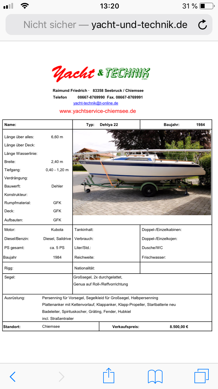 hier bei uns am Chiemsee wird eine Dehlya22 mit Innenborder und Saildrive bei Yacht&Technik angeboten.