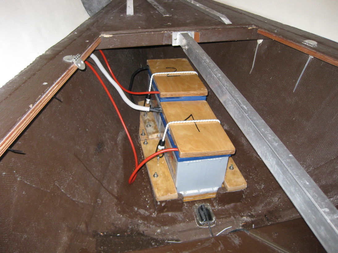 Meine Batterien habe ich übrigens auch in den Bug verfrachtet. Unten der Sockel ist aus Epoxidharz und ist am Rumpf anlaminiert, dadurch bleiben die Batterien in jeder erdenklichen Situation an ihrem Platz.