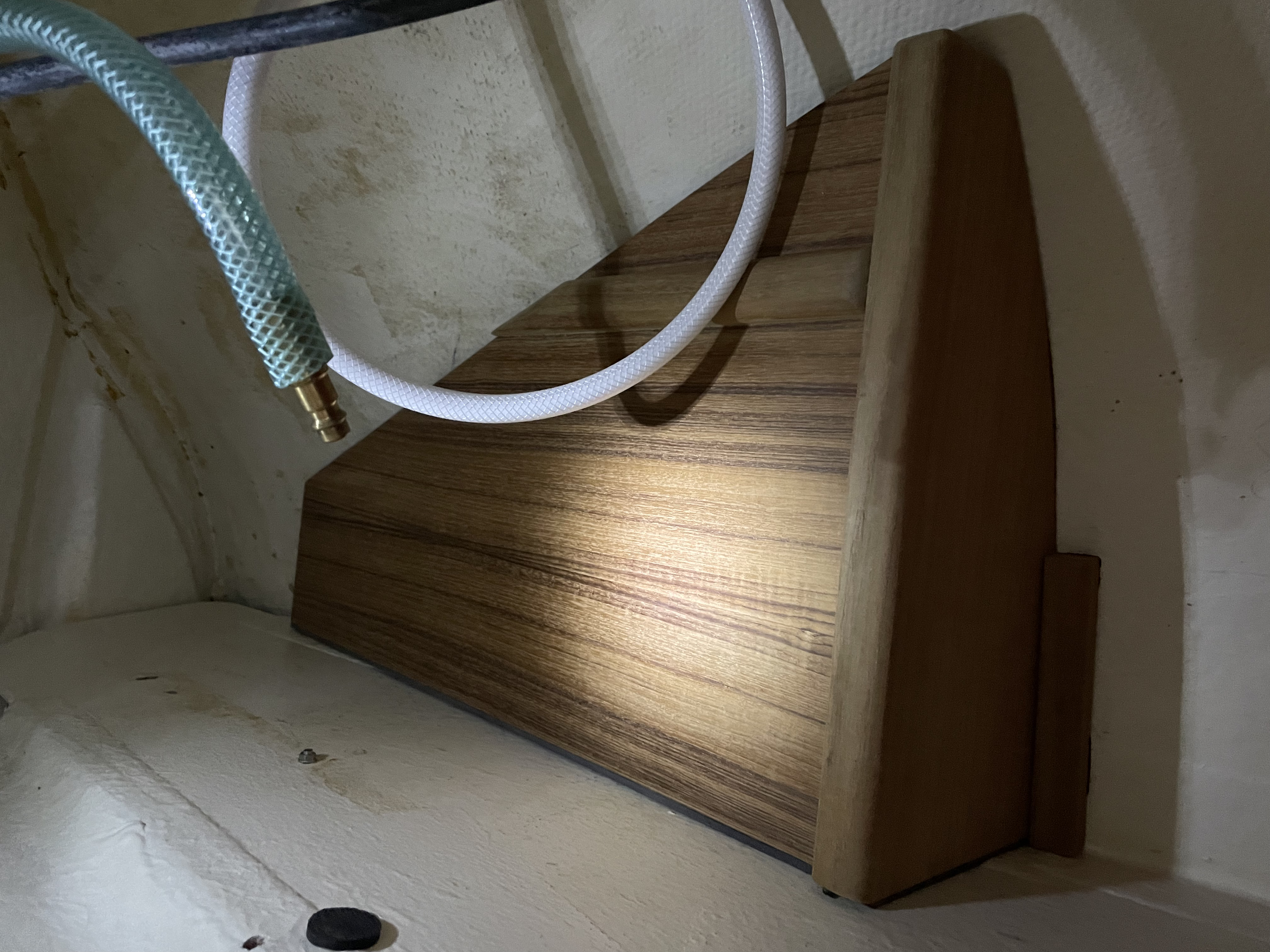 Ich habe zunächst mit dauerelastischer Dichtmasse das Schott zwischen Backskisten ( Steuerbords habe ich das auch gleich mitgemacht !) und Salon abgedichtet ; weiter habe ich eine weitere Tankentlüftung im Bereich der Badeleiter backbordseitig am Heck installiert ( auf der Steuerbordseite befindet sich bereits die Entlüftung für das Wasserballastsystem )
