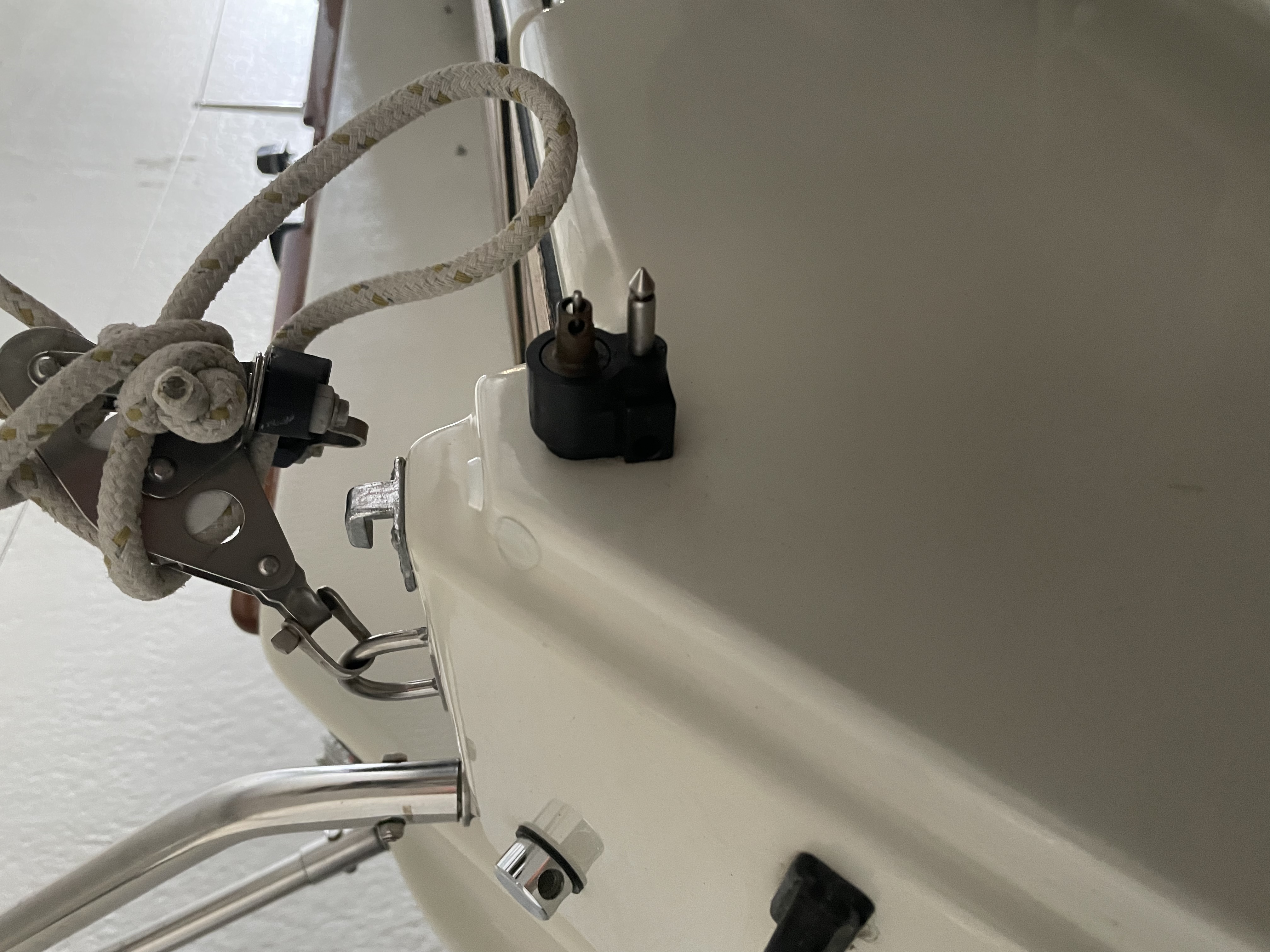 Auf der Steuerbordseite des Hecks im Bereich der Aufnahme für den Flaggenstock habe ich eine 12 v Steckdose platziert an die der Außenbordmotor angeschlossen werden kann - geschaltet ist das ganze so , daß ich einerseits Strom für den E - Starter entnehmen kann und andererseits auch über die Ladespule des Aussenborders die Bordbatterie laden kann …