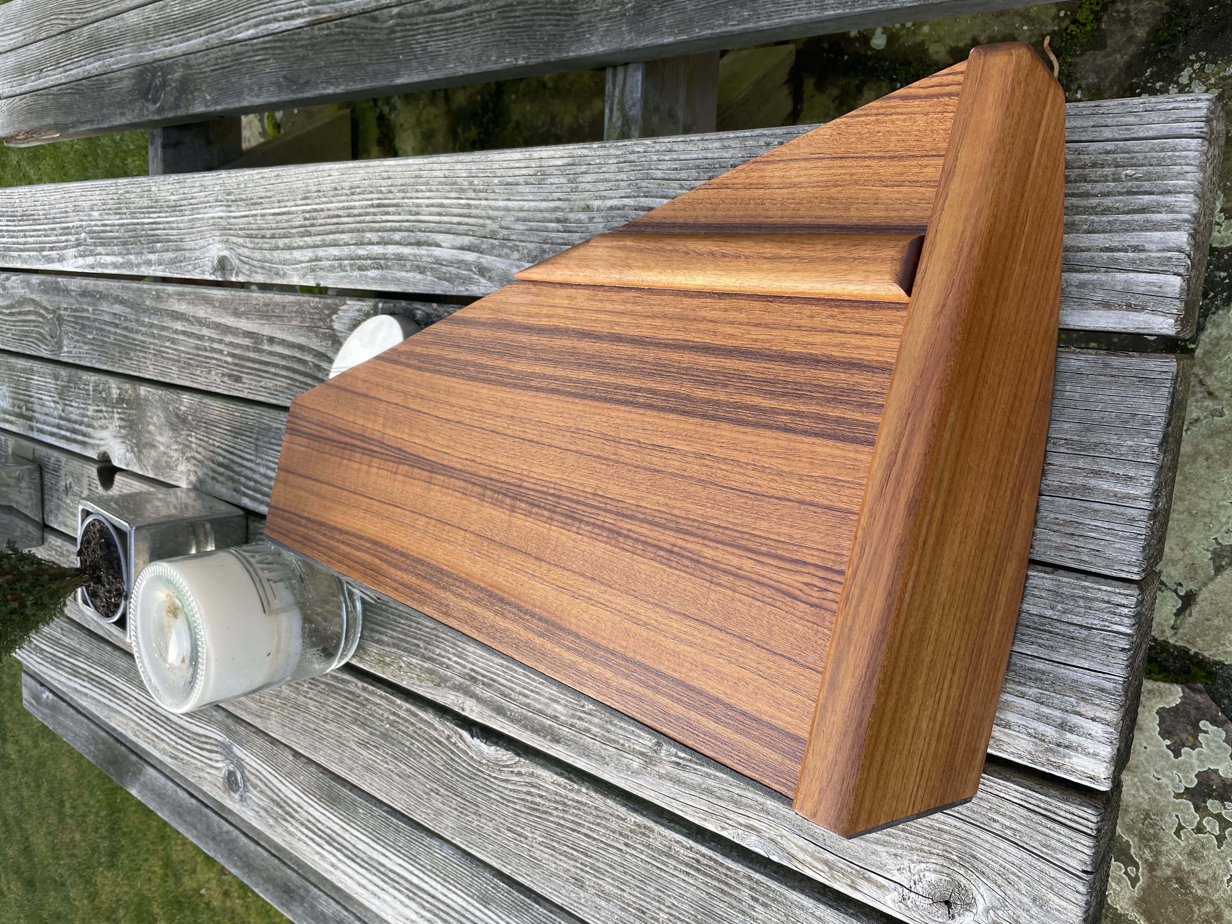 Der Aussenbordertank wird jetzt auf einem aus Teak gefertigten - und seit heute frisch geölten - Podest fixiert und wird mit der Tankentlüftung und einer im Cockpit im Bereich der Heckklappe geschützt verbauten Bajonettkupplung des Benzinschlauchs verbunden ; an diesen Bajonettverschluß wird der Benzinschlauch zum Aussenborder angeschlossen ;