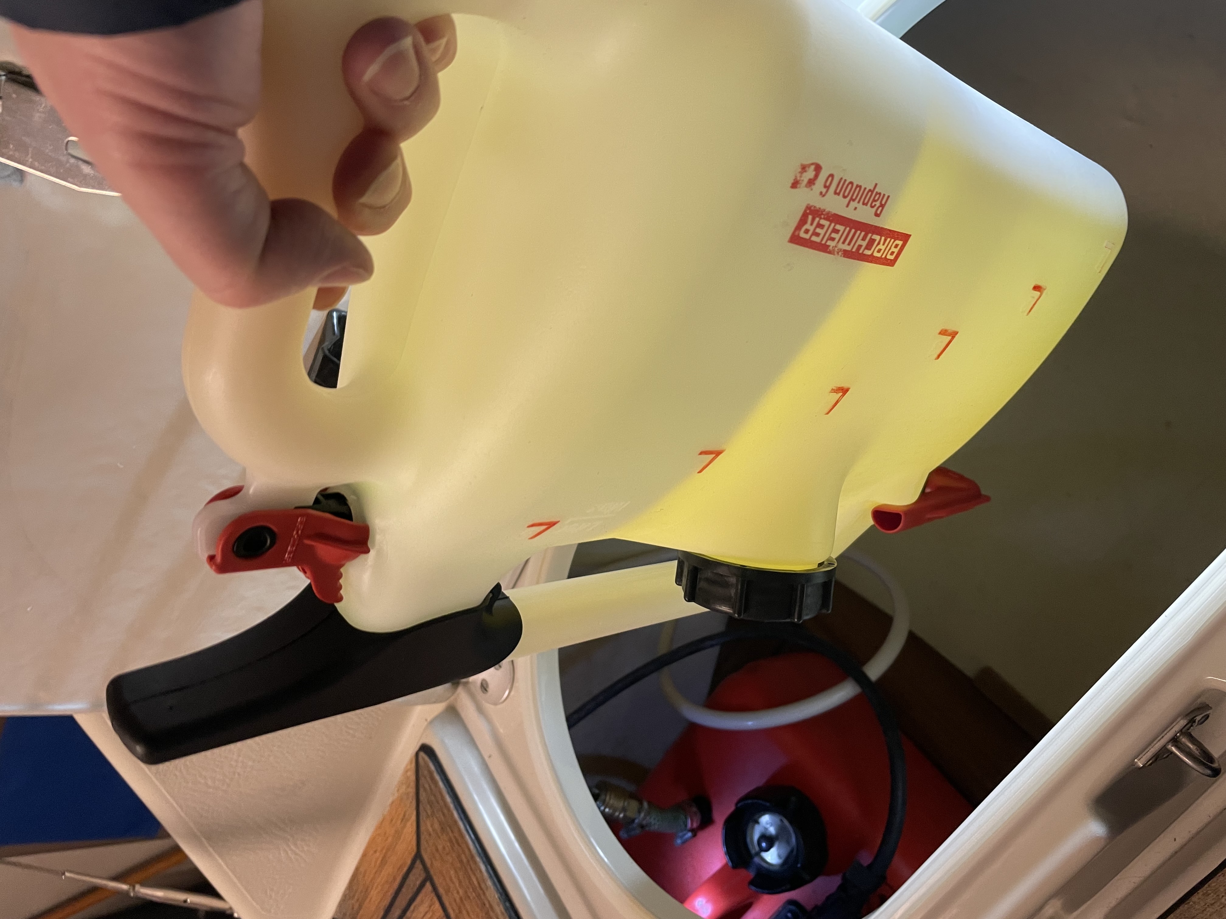 .... hier noch ein ergänzendes Foto, auf dem man sehr schön sieht, wie der Rapidon - Kanister in die Backskiste hineingehalten werden kann, um den dort befindlichen Aussenbordertank tropffrei zu befüllen ...