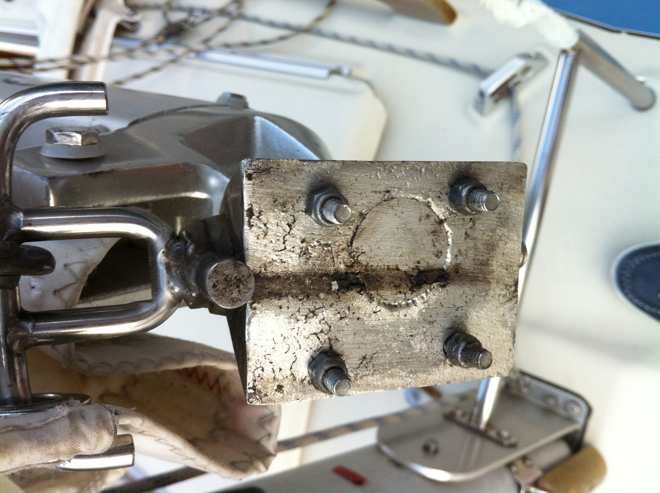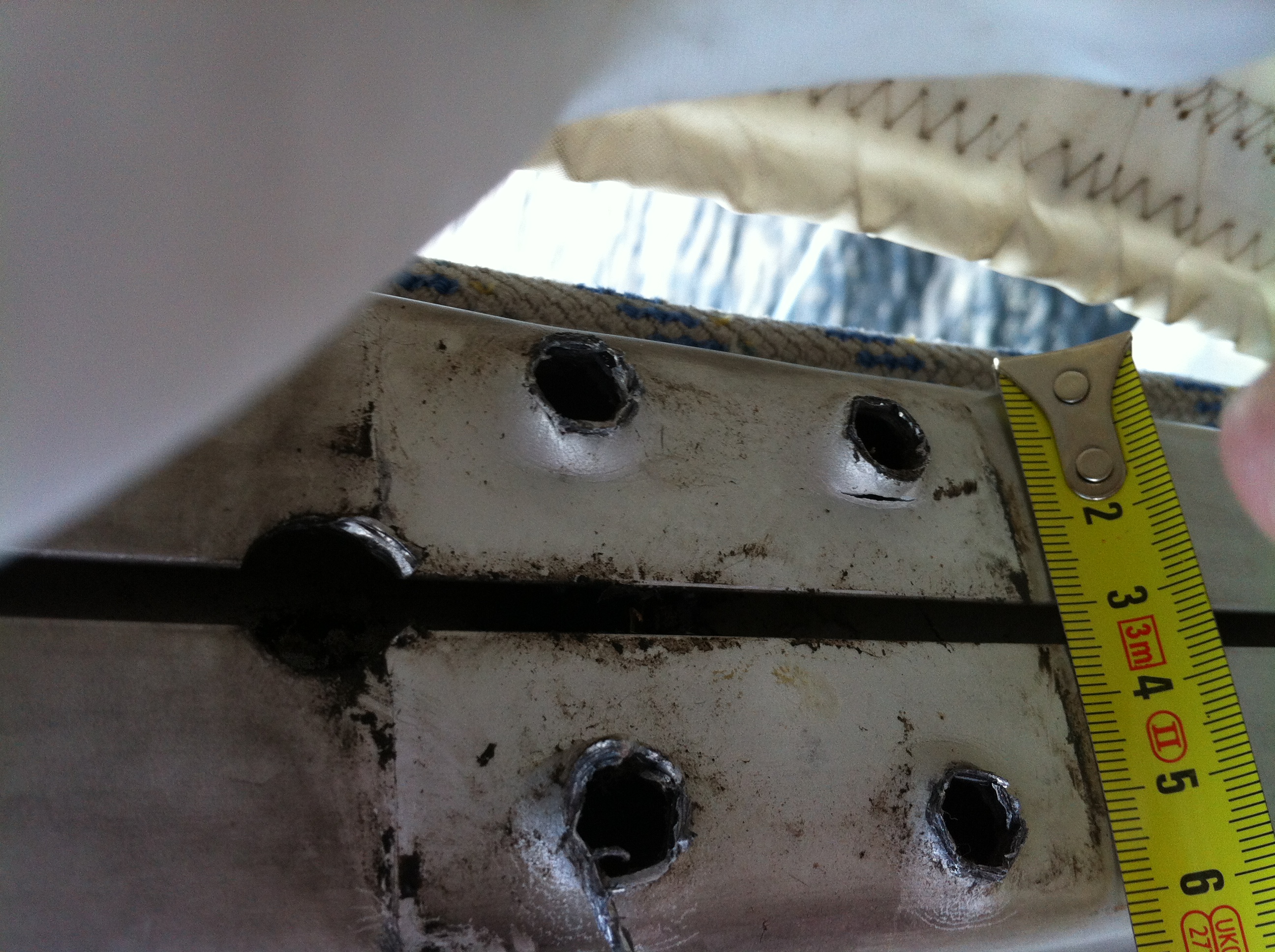 Wenn Ihr die beiden Fotos betrachtet wisst Ihr, wo mein Problem liegt. Die 4 Schrauben zur Befestigung des Mastbaumes am Mast sind ausgerissen, blöderweise kann man da schlecht etwas beilegen und kommt (nachdem der Spalt mit grade mal rd. 5 mm nicht unbedingt breit ist) nicht wirklich gut mit Werkzeug dazu.
