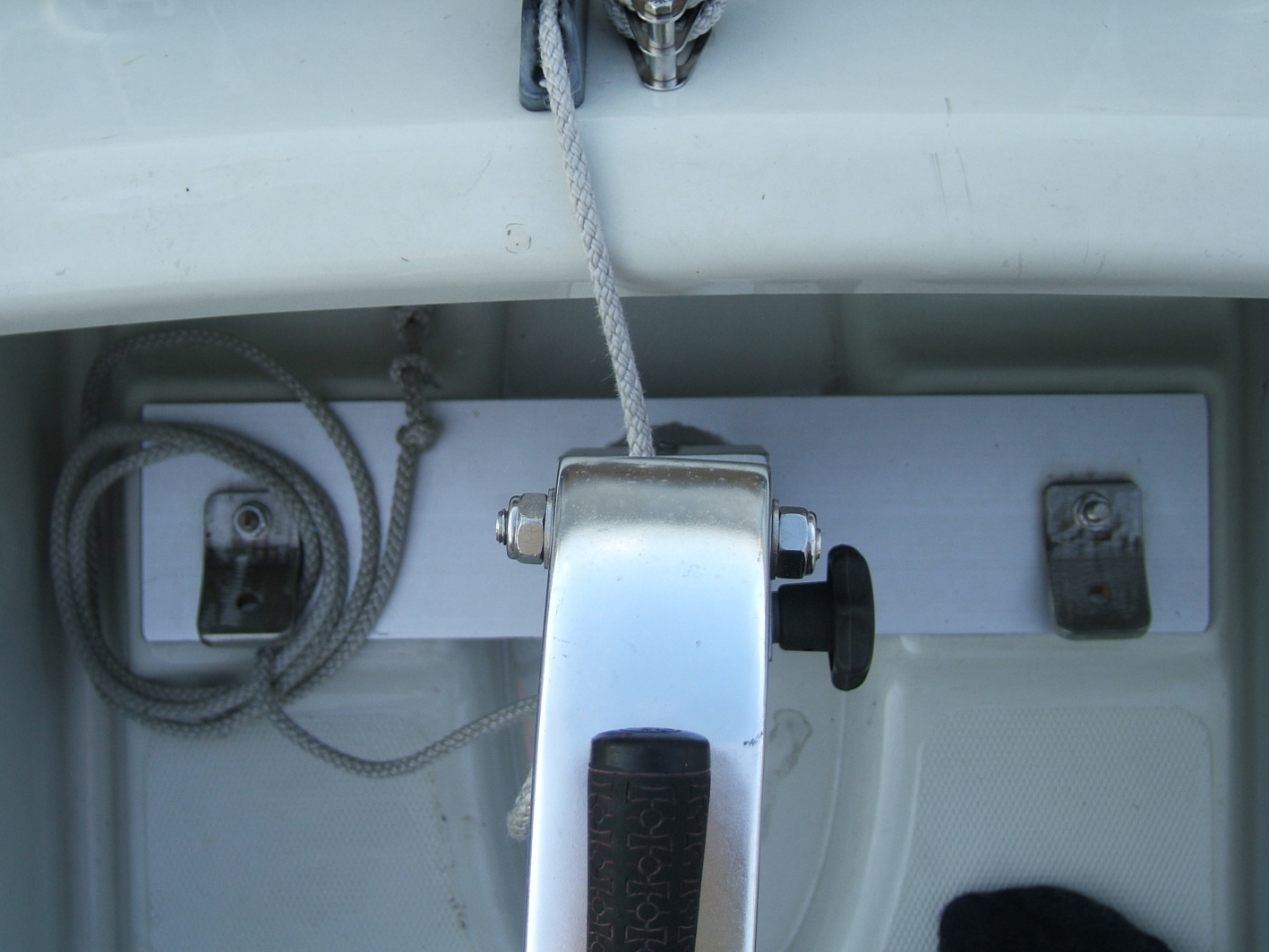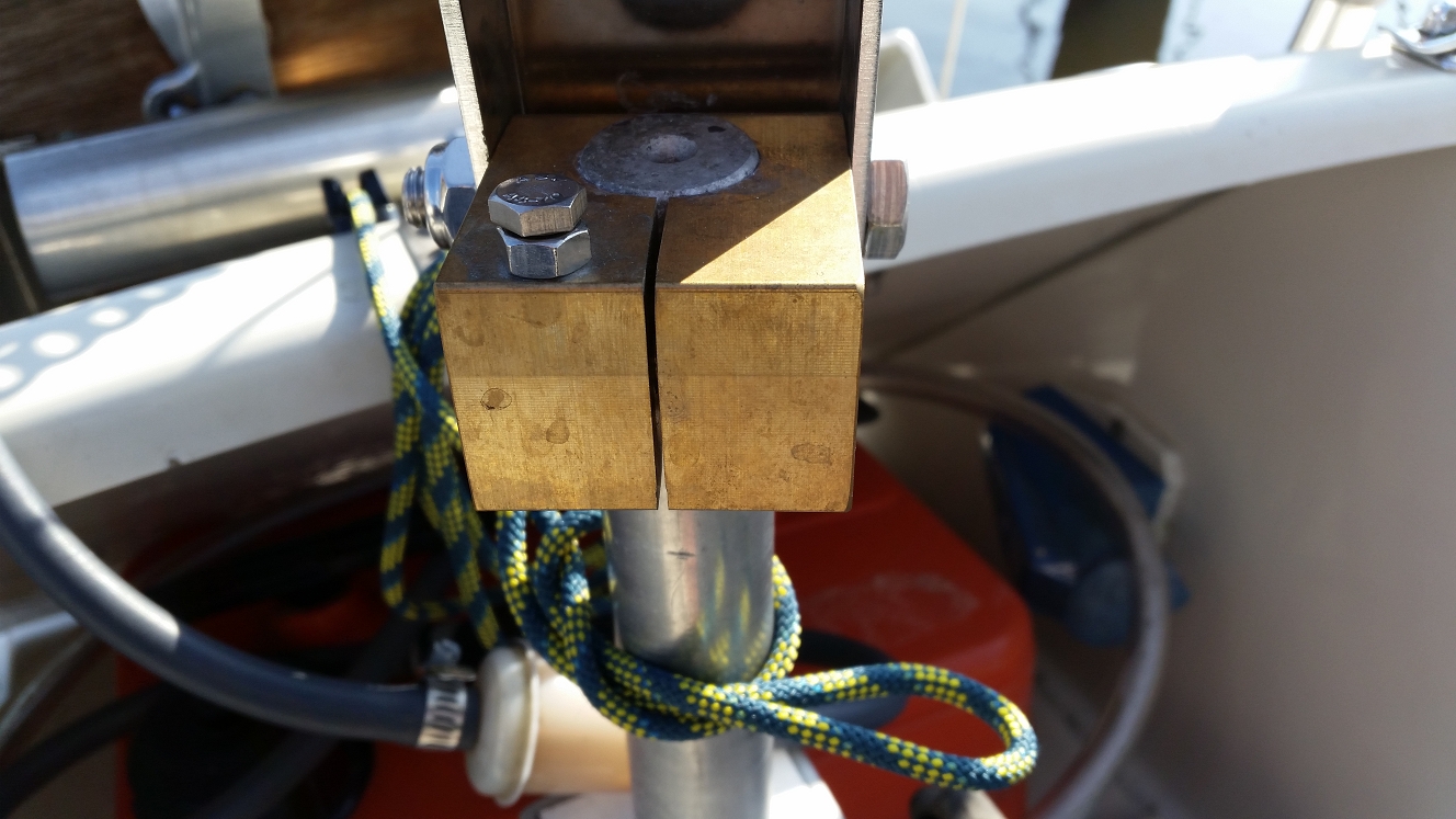 Die Ruderwelle ist ja über ein Gelenk mit der Pinne verbunden. In dieser Verbindung steckt eine Welle, bzw. bei mir eine Schraube.