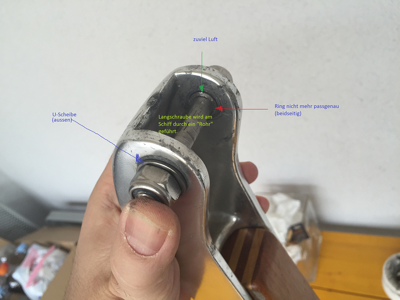 Meine Schraube ist jedenfalls nicht der Originalzustand und die beiden Hülsen in dem Alukopf der Pinne sind nicht rostfrei, daher wahrscheinlich