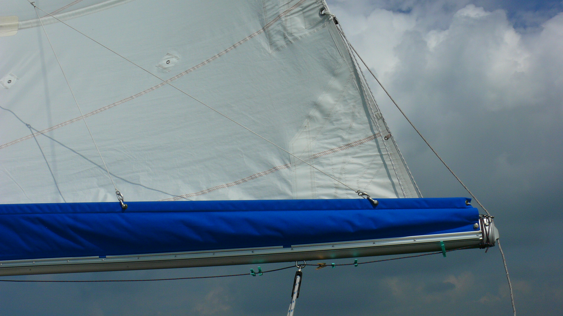 diese gibt es an der Hinterkante offen oder geschlossen. Die geschlossene Variante ist die Richtige. Dirk am Masttopp mit Palstek befestigen, 8-Knoten am unteren Ende, ca 20 cm tiefer, als der Baum beim Segeln steht. Das ist schnell und unkompliziert in der Bedienung und absolut einhandtauglich, sogar besser als die Dirk aufs Kajütdach neben dem Niedergang umzuleiten, denn da kommst du einhand auch immer in Schwulitäten.