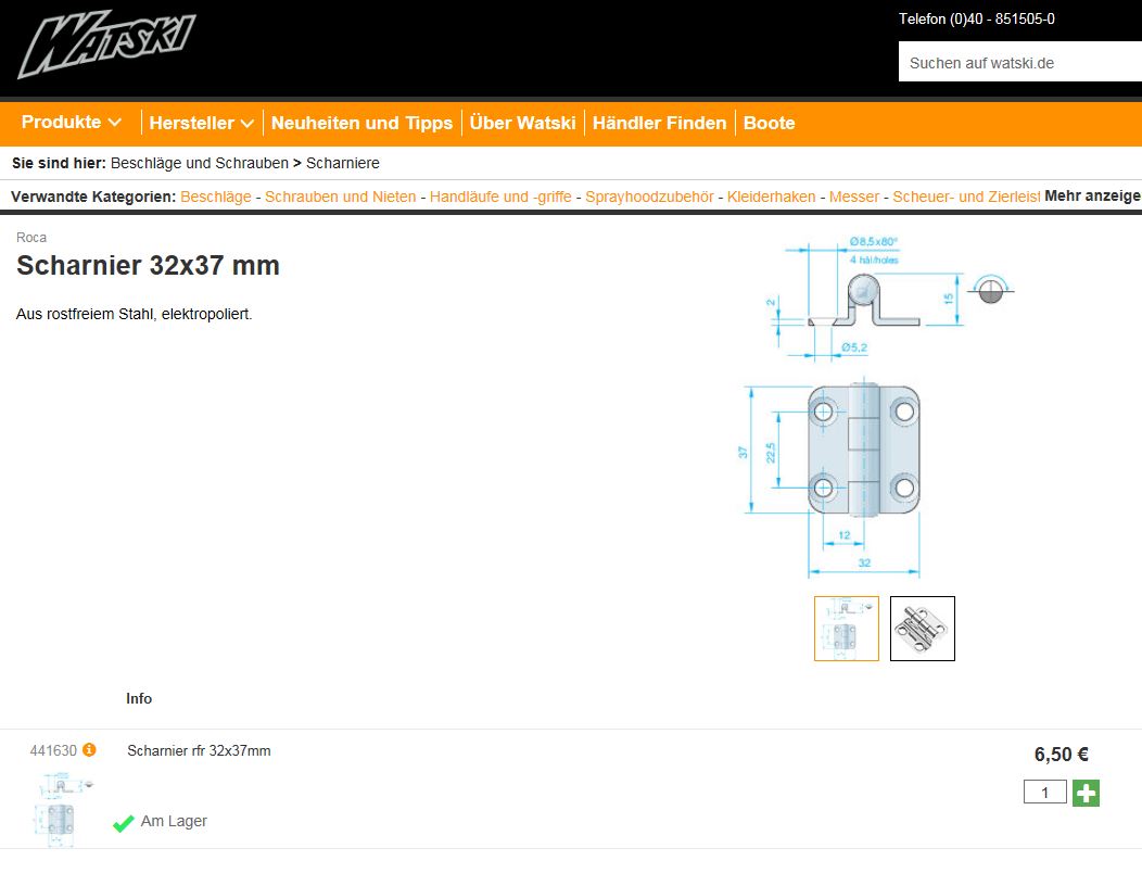 ich habe meine Schiebepantry an Backbord neben dem Niedergang entfernt. Das verbliebene Loch möchte ich nun mit einer Tür verschließen. Dafür benötige ich möglichst 2 Scharniere, wie sie bei allen anderen Türen auch verbaut wurden: