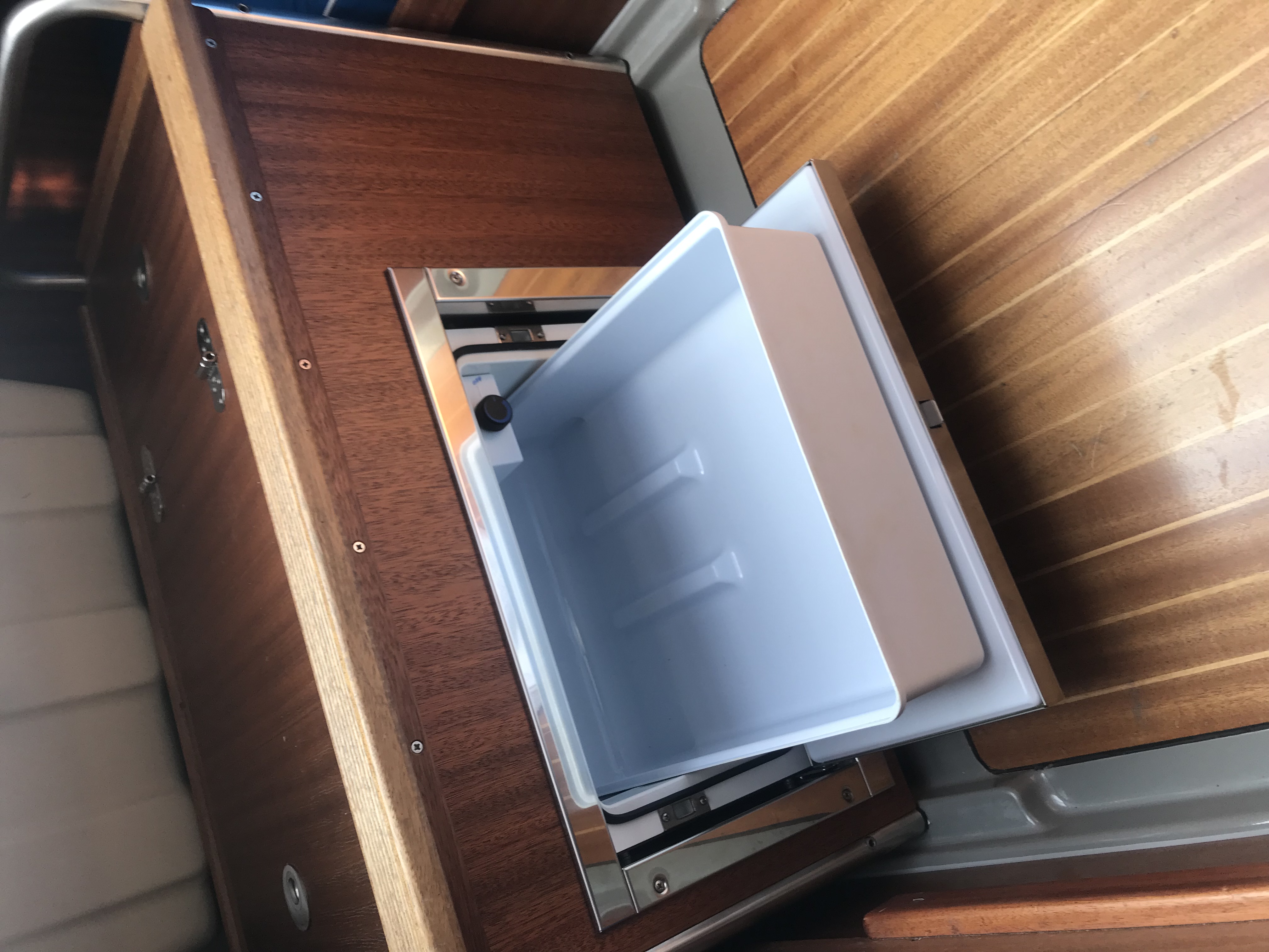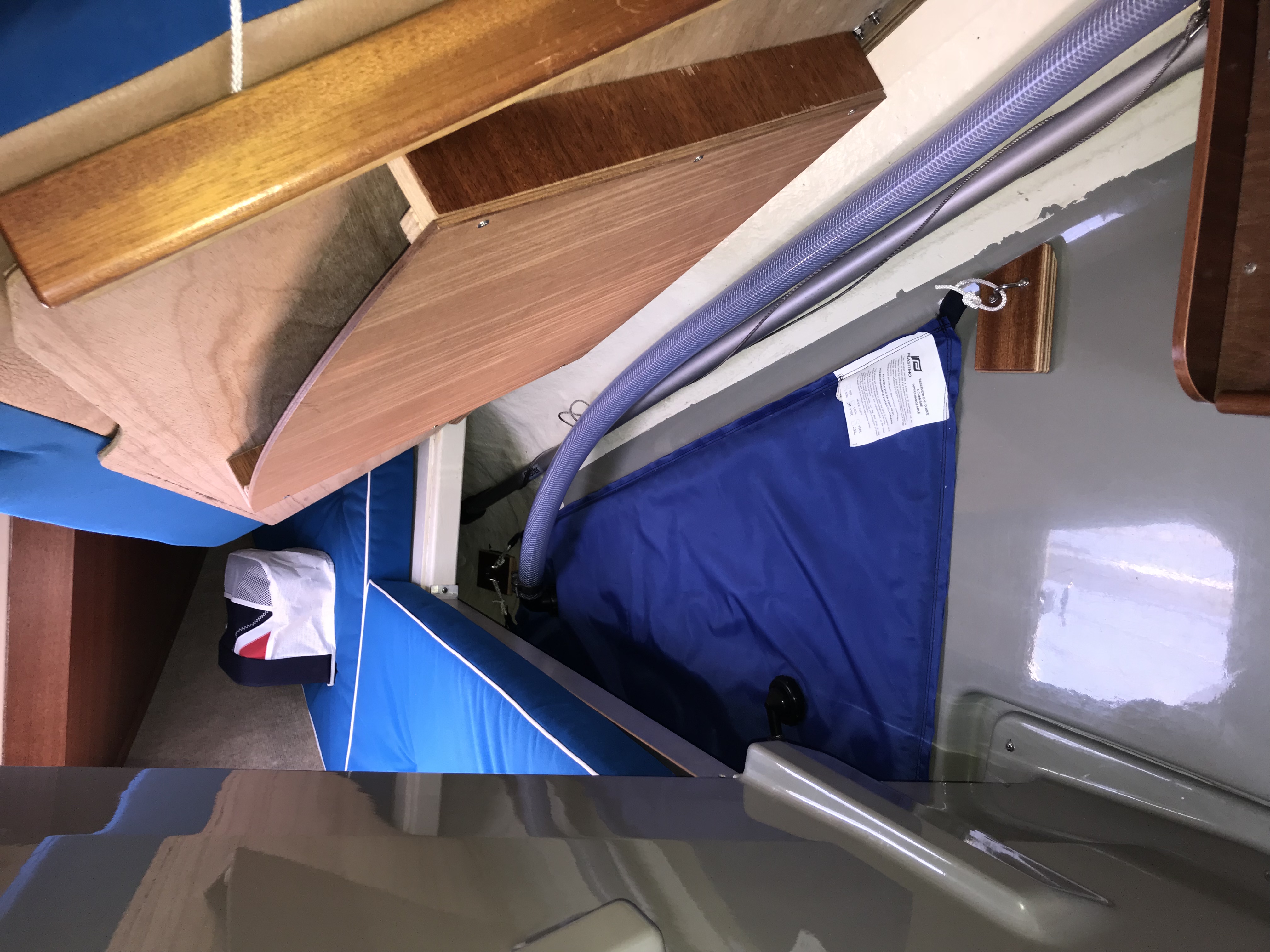 Waschbecken, Abwasserkanister und Frischwasserkanister ( ohnehin alles eher spielzeughaft dimensioniert ) raus aus dem serienmäßigen Pantryblock, stattdessen wurden dort ein Kompressorkühlfach und ein INOX - Mülleimer mit Deckel, installiert , vorne unter den Vorschiffskojen liegt jetzt ein flexibler 120 l Tank von Plastimo, steuerbord im hinteren Bereich des Laufdecks wurde der Trinkwassereinfüllstutzen und am Heck auf der backbordseite wurde die Duscharmatur platziert.