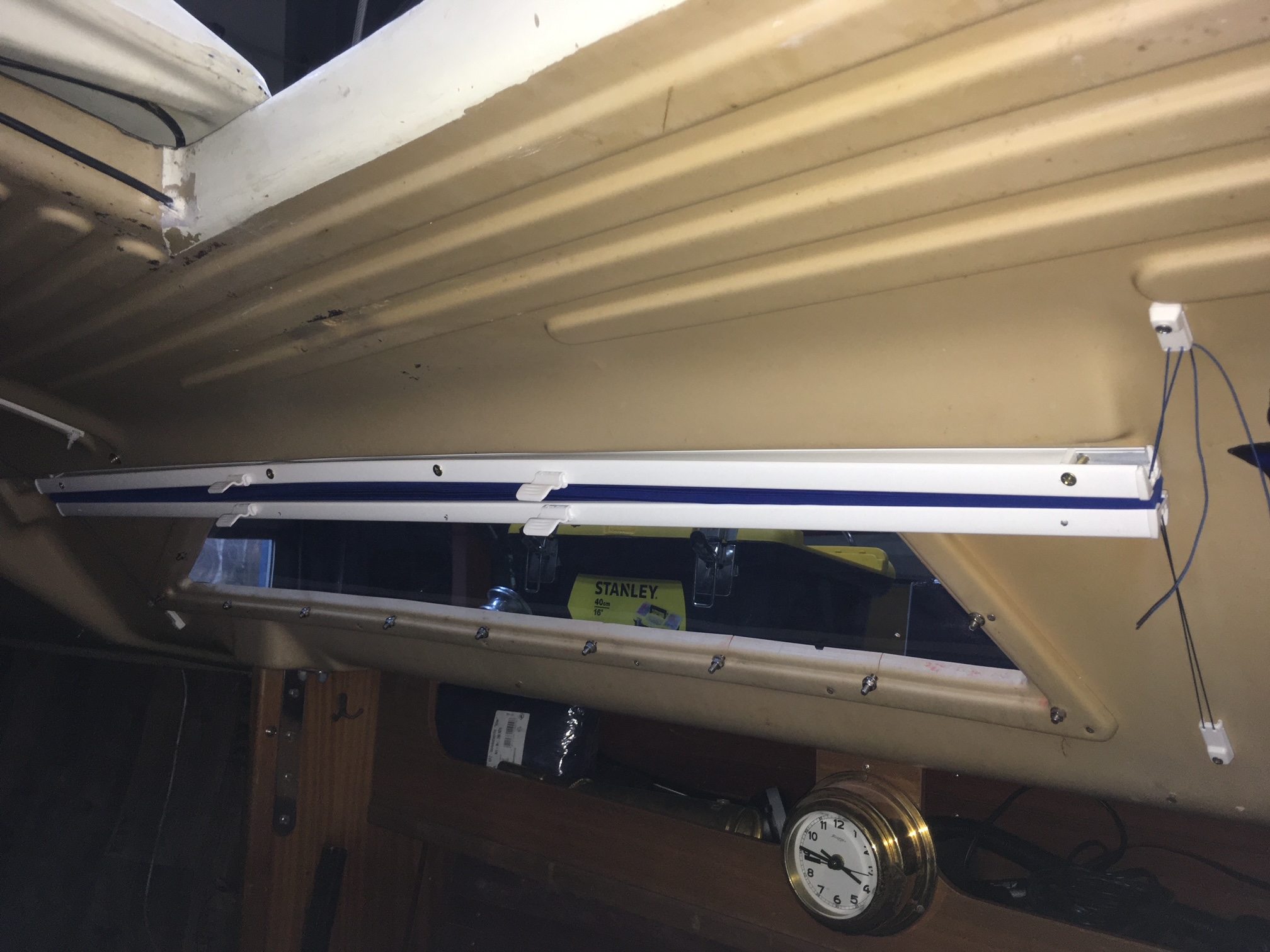 aus dem gleichen Stoff habe ich noch einen anklettbaren Sichtschutz für das Einstiegsluk und die Vorschiffsluke gefertigt, so daß im Salon nunmehr eine durchaus akzeptable Privatspähre geschaffen werden kann,