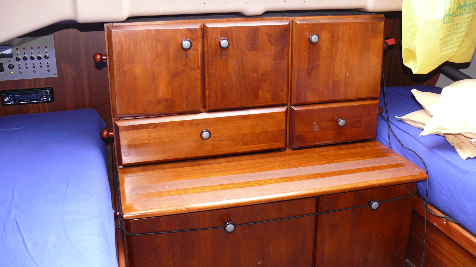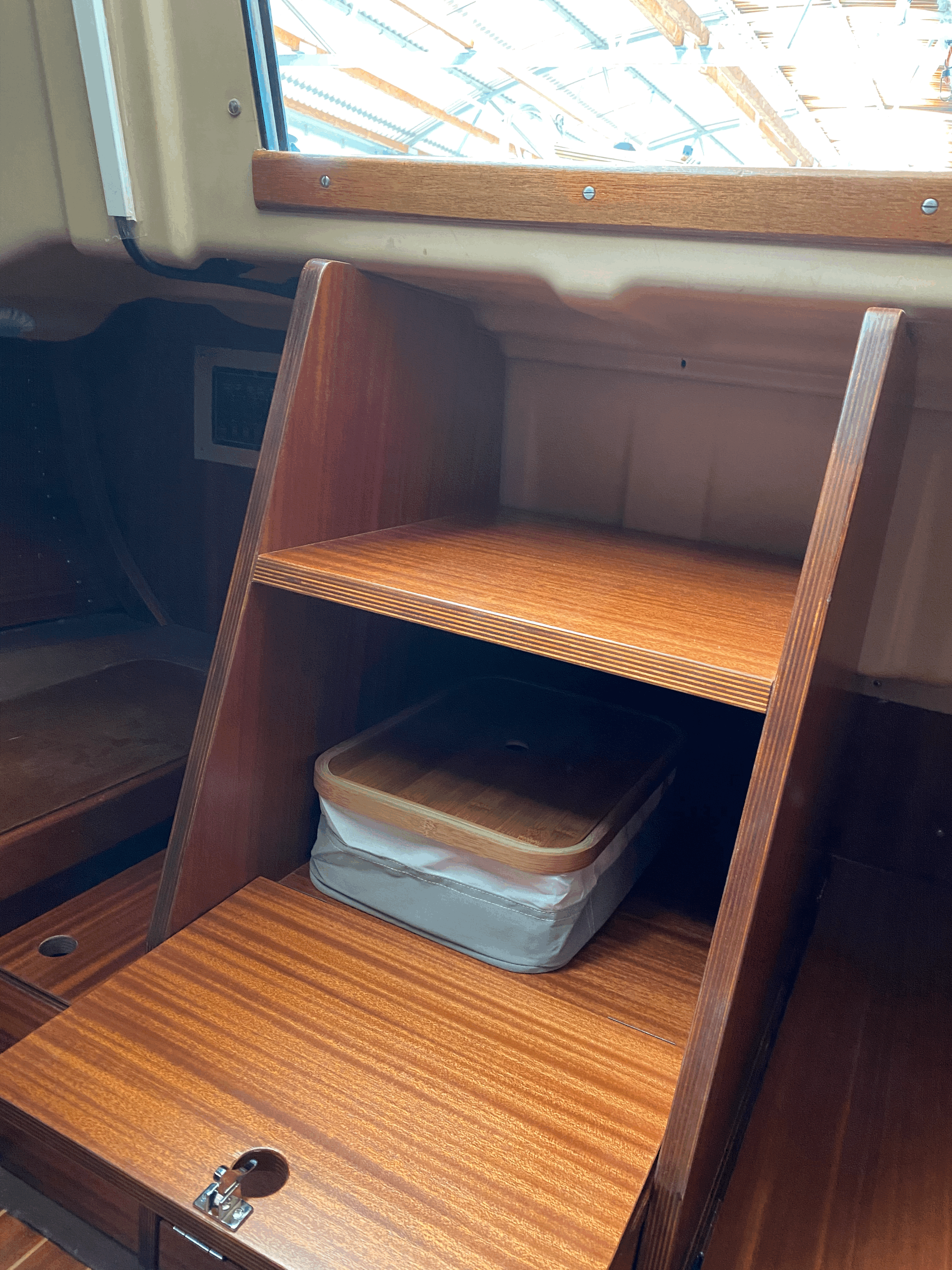 Ich finde es wirkt nicht zu klobig. Die Staufläche ist dennoch recht großzügig. Bspw. kann man in das untere Fach sehr gut den zweiflammigen Origo-Kocher verstauen. Der Niedergang ist aufgrund der Stärke der Platte sehr stabil. Er ist fest mit dem Schott verschraubt und kann nicht verrutschen.