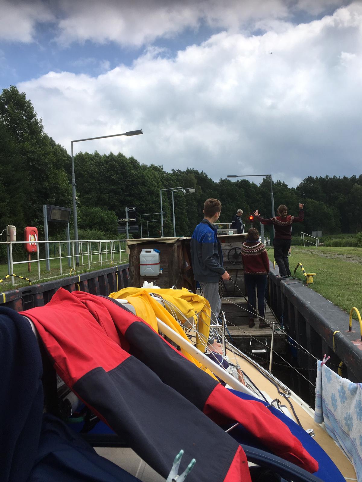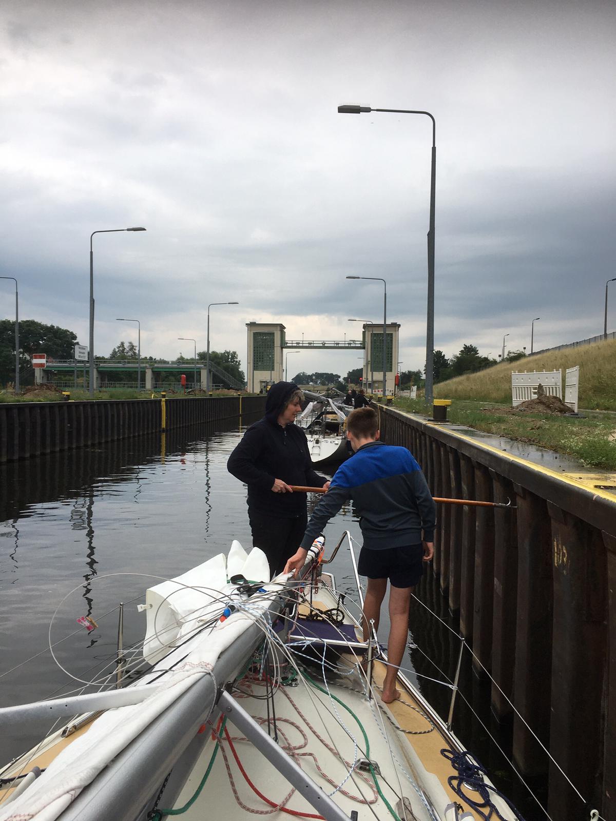 Weiter ging es, begleitet durch Nieselregen, die Hohensaaten-Friedrichstaler-Wasserstraße auf die Westoder. Vorbei an Schwedt, Garz und Mescherin. Unser heutiges Ziel war die Marina Goclaw im nördlichen Stettin. Um 16.30 Uhr sind wir dort eingelaufen. Eine kleine aber feine Marina mit sehr sauberen Sanitäranlagen, einem freundlichen Hafenmeister und einem Restaurant gleich um die Ecke. Gegenüber der Marina befindet sich ein kleiner Kaufmannsladen der fast alles vorhält. Wir haben den Mast gestellt und uns gefreut, dass wir nun wieder als Segelboot weiterfahren konnten.