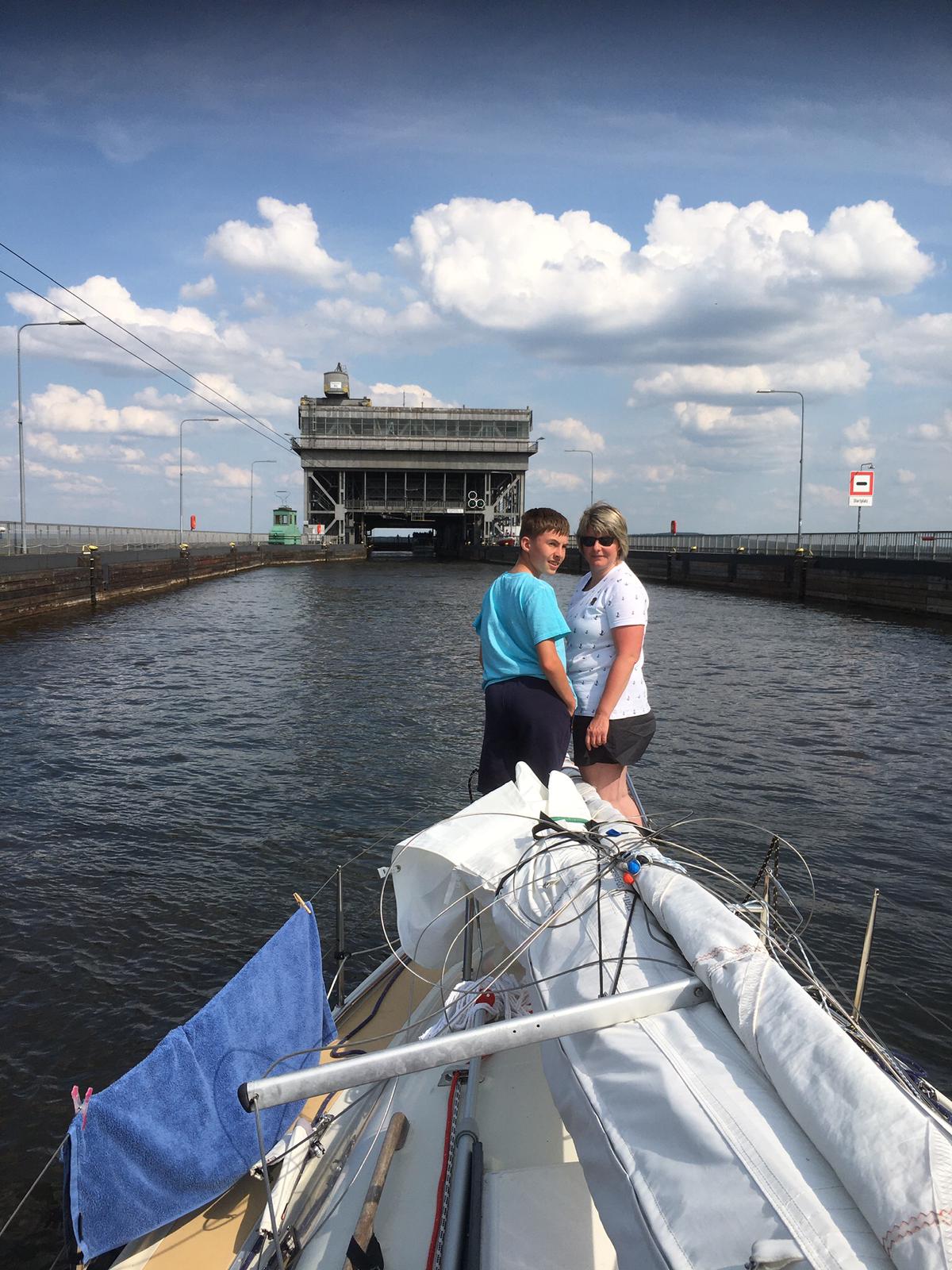 Wir haben um 07.00 Uhr die erste Schleuse genommen. Diese war zügig erreicht da sie sich gleich hinter dem Hafen befindet. Die Schleusen Bischofwerder und Liebenwalde konnten ohne Wartezeit passiert werden. Gegen 11.00 Uhr haben wir den Oder-Havel-Kanal erreicht. Dieser hat landschaftlich nicht sehr viel zu bieten. Hier begegneten uns die ersten Segler. Trotz der Eintönigkeit vergingen die 4 Stunden Fahrzeit bis zum Schiffshebewerk Niederfinow sehr schnell. Um 15.00 Uhr machten wir an den Dalben an der Wartestelle für Sportboote fest.