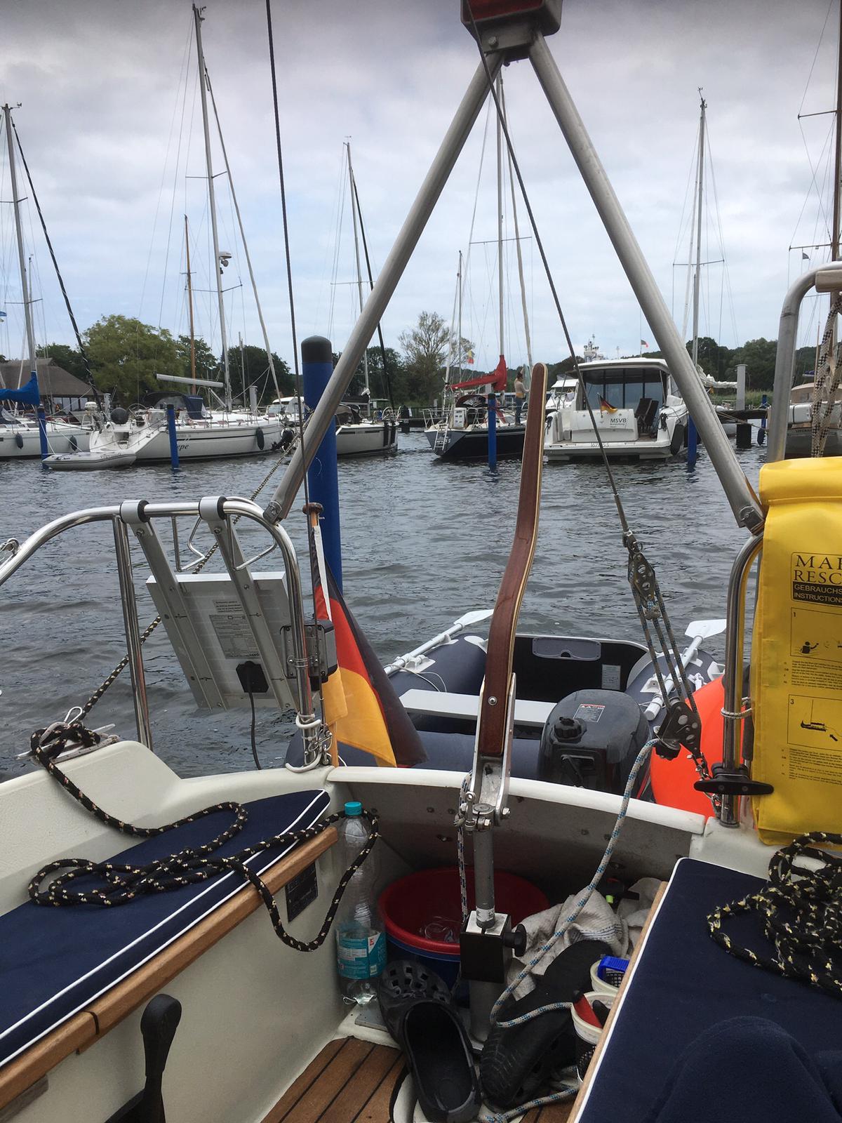 Der Wetterbericht sagte für die Region um die Insel Usedom am frühen Abend aufkommende Gewitter voraus. Unser Plan war an der Küste entlang nach Peenemünde. Also früh aus Swinemünde ablegen auf Kaiserfahrt bei Kaiserwetter und 3 Bft aus Nordost. Es war segeln vom feinsten. Gegen 12.00 Uhr haben wir die Ansteuerungstonne Osttief erreicht, als wie aus dem nichts Quellbewölkung aufzog und es anfing zu donnern. Wir konnten schnell die Segel bergen als ein Gewitter mit Starkregen einsetzte. Es blieb nichts übrig als Klamotten aus Motor an und durch die Gewitterfront. Nach 1,5 Stunden Fahrt im Fahrwasser haben wir den Nordhafen von Peenemünde, begleitet durch Blitz, Donner und Regen, erreicht.