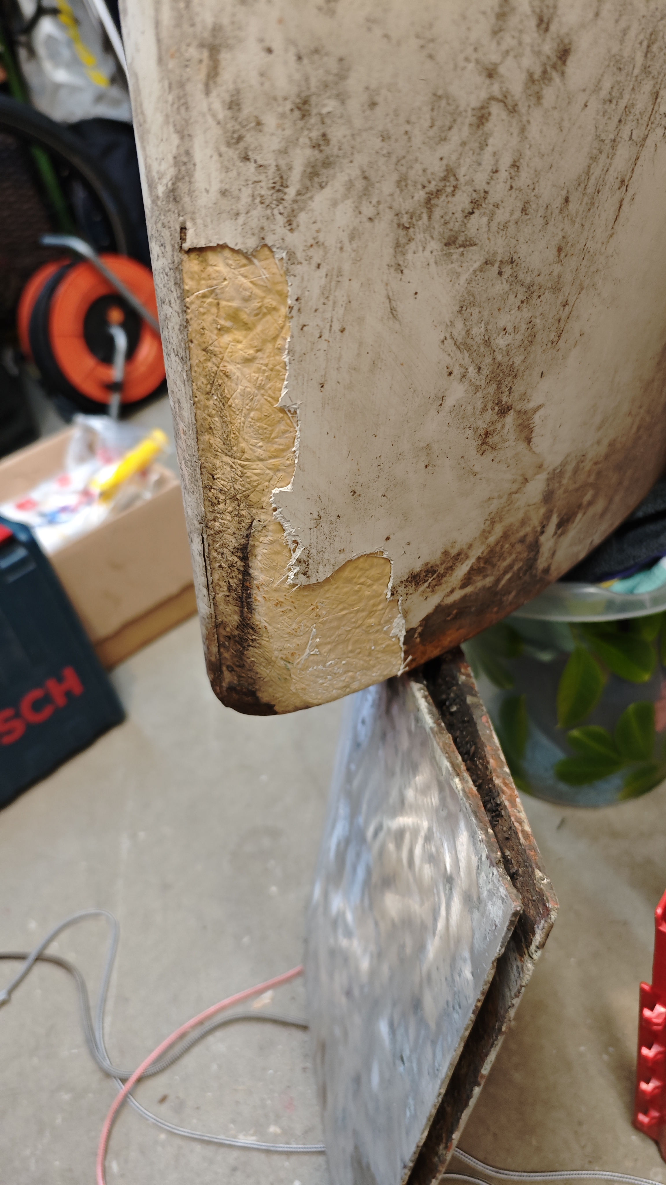 Ich würde hier mit einem GFK- Reperatur Set arbeiten. Die noch vorhandenen Flächen anschleifen. Das Loch mit Glasfaser Vlies auffüllen und mit den