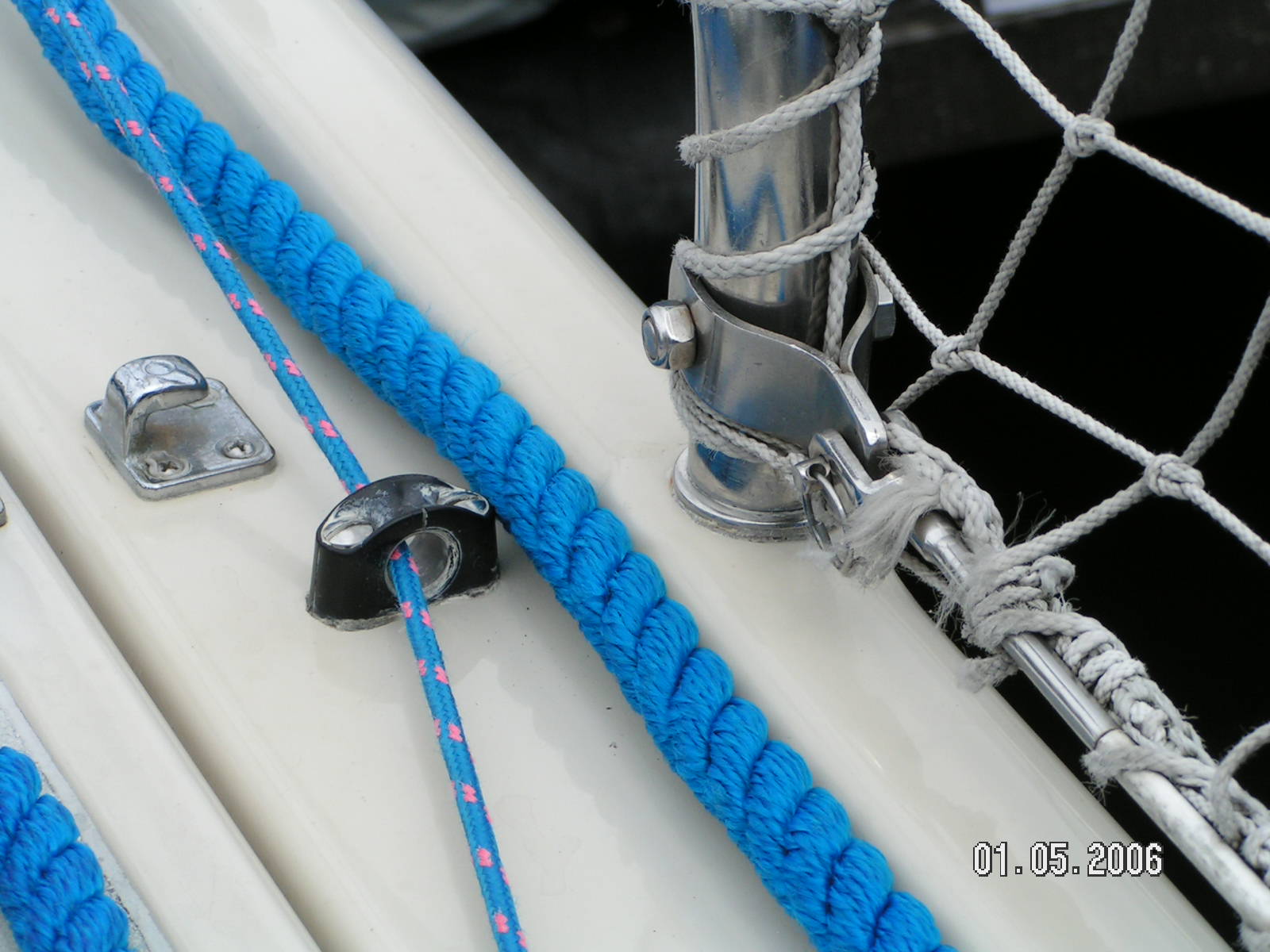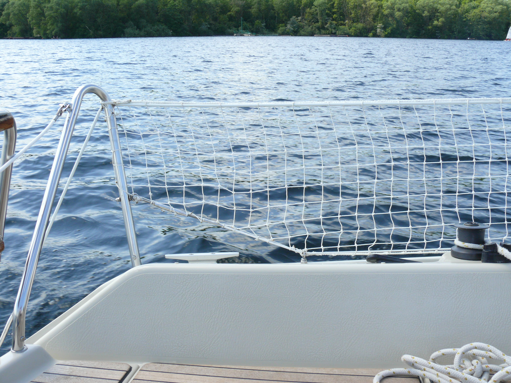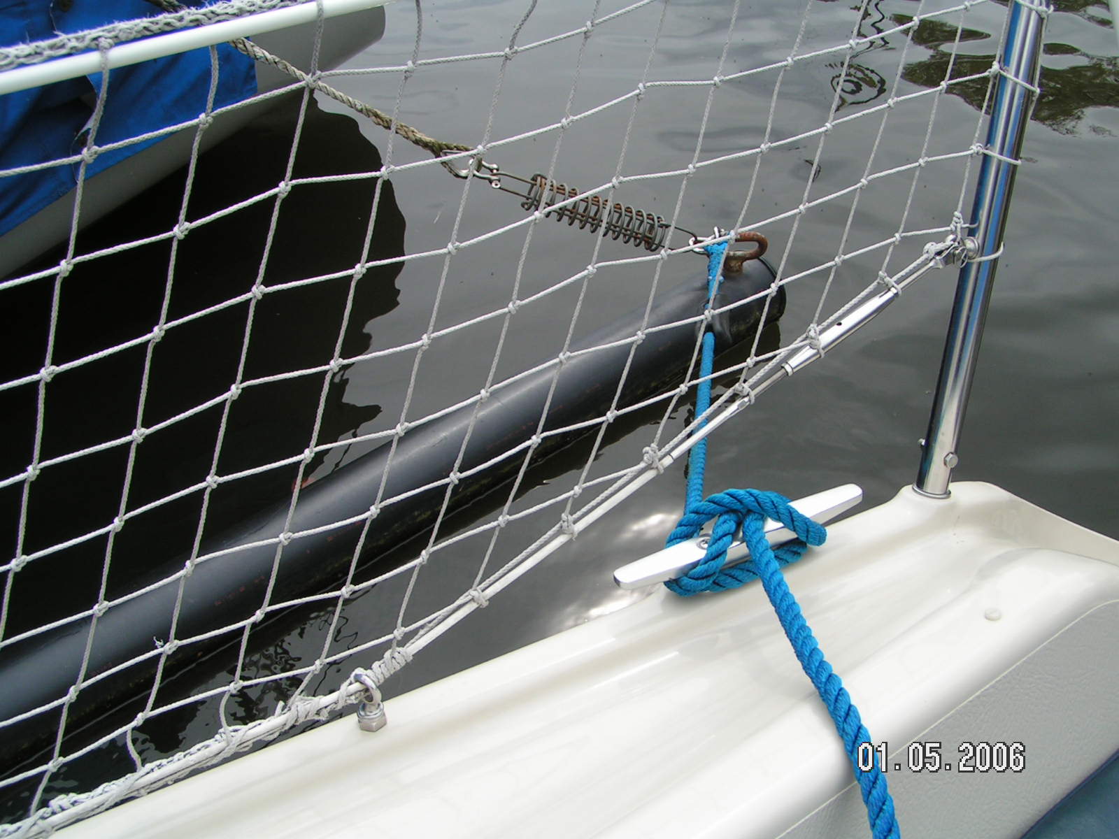 hätte ein paar Fotos meiner Dehlya zu bieten, auf denen zu erkennen ist, wie ein Relingsnetz mithilfe eines unten angebrachten Relingsdrahts montiert wurde, eine gute Lösung, da das Relingsnetz dadurch auch gut gespannt ist.