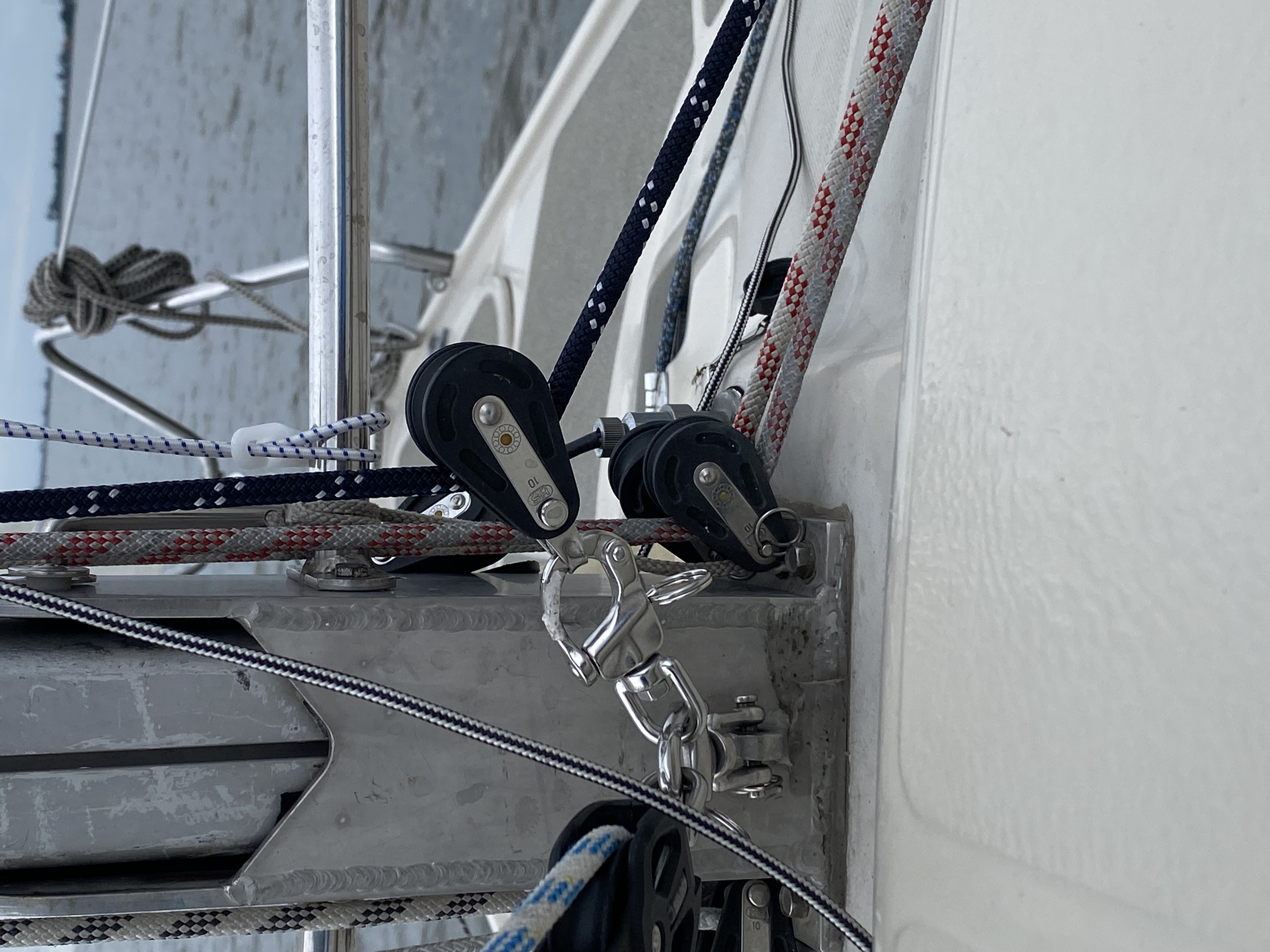 anbei ein Foto davon, wie es bei mir gelöst war. Dafür brauchst du aber eine freie Hebelklemme und eine freie Umlenkrolle nach achtern auf dem Deck. Das wirst du standardmäßig aber nicht haben. Das Umrüsten mit all den Teilen ist nicht billig. Gewitzt ist der Haltepunkt des unteren Cunninghamblocks am dem Punkt, wo standardmäßig der Baumniederholerblock befestigt wird. Hier wurde ein flacher Blechschäkel zusammen mit dem eigentlichen Schäkel für dem Block wie ein Sandwich übereinander montiert. Quasi großes U über kleines u.