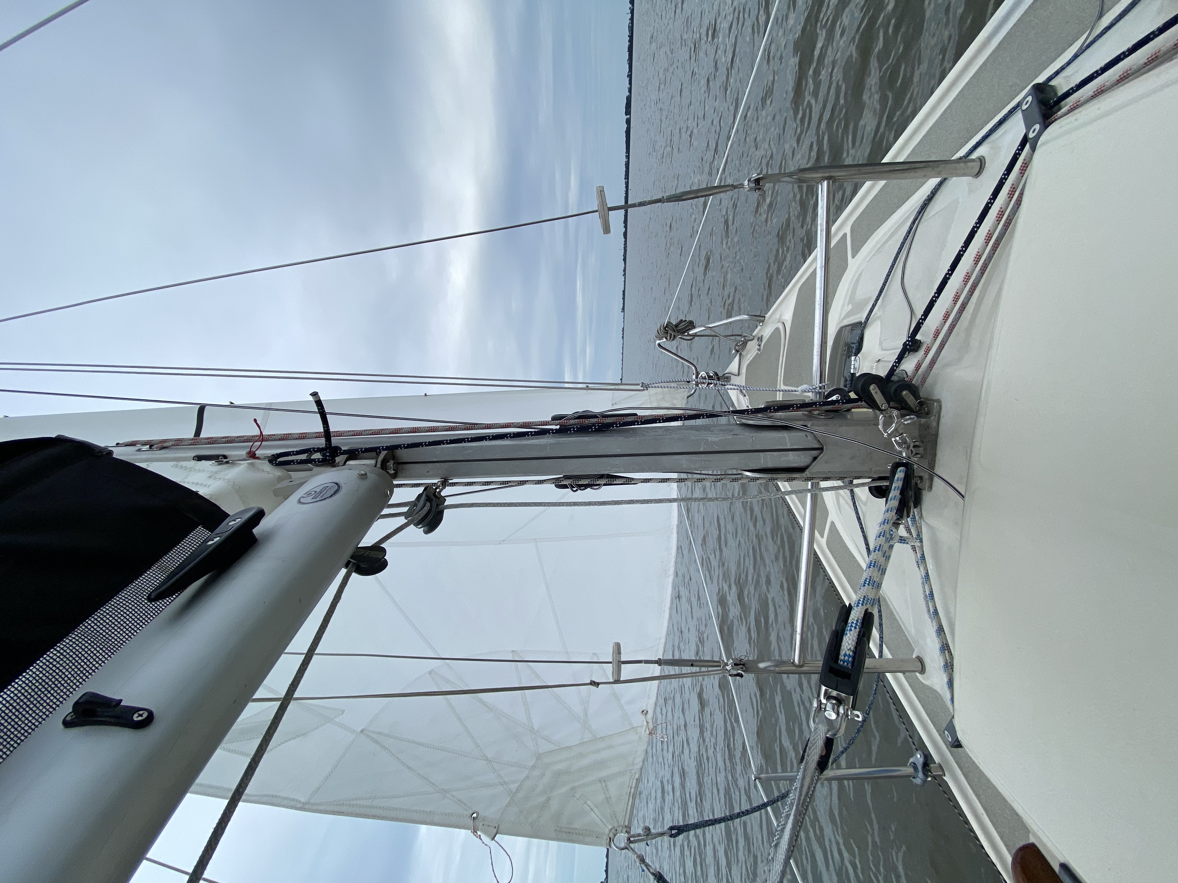 Nächster kleine Baustelle ein paar Falten in der Fock weit oben! Hat jemand eine Idee woran das liegen könnte und wie man es wegbekommt. Ich vermute es liegt daran, dass das Segel auf der Trommel gerollt wird und vermutlich dort ein paar Knicke hat. Es ist noch sehr steif.