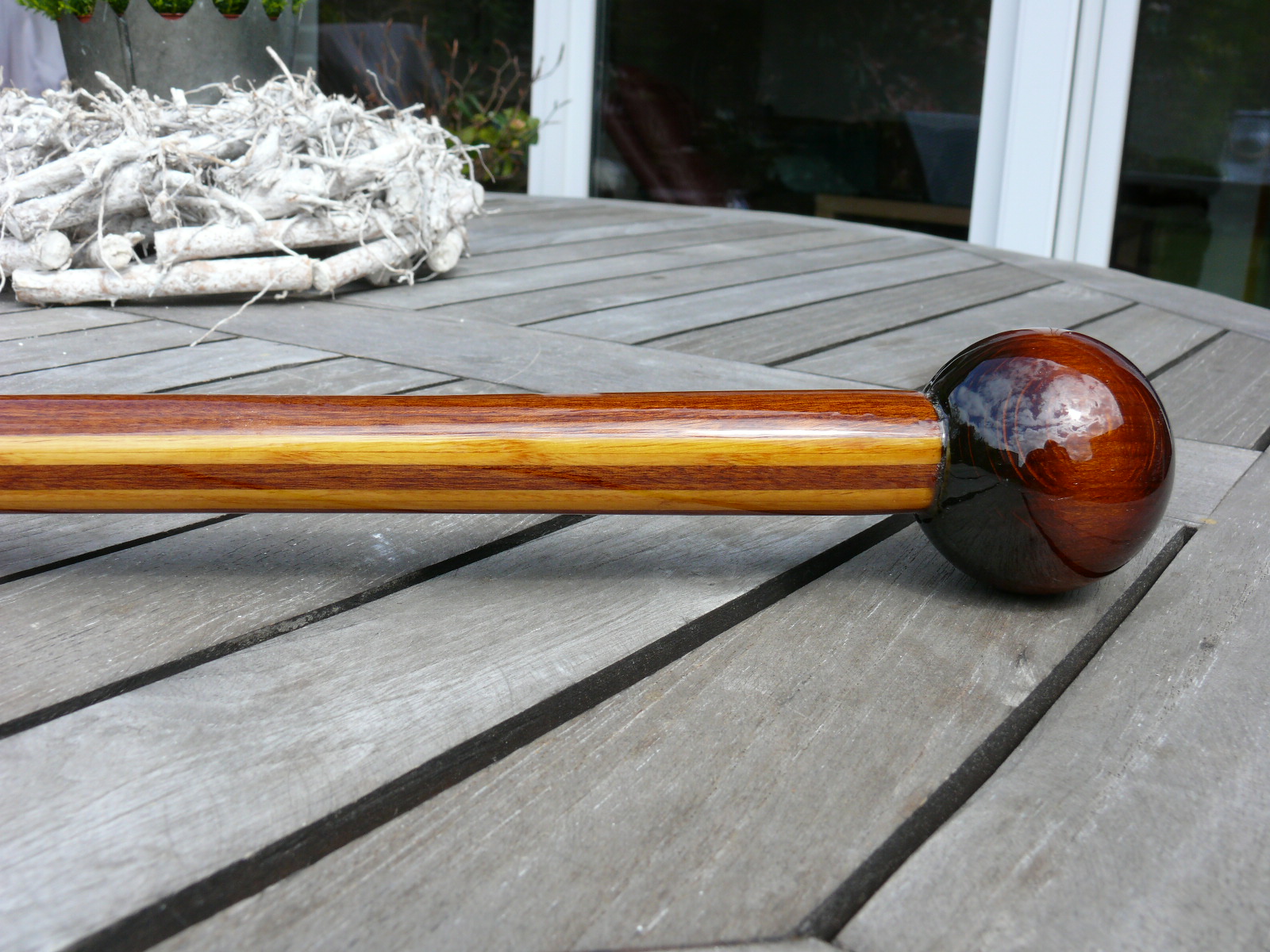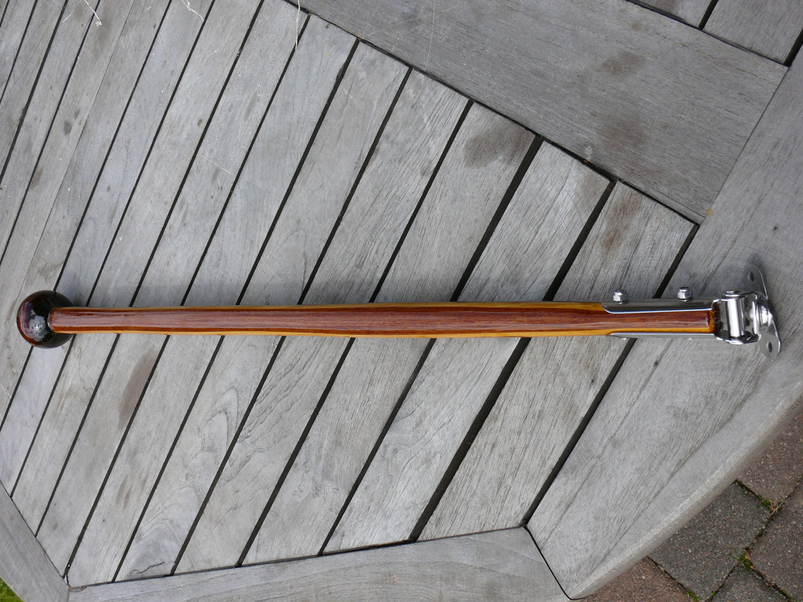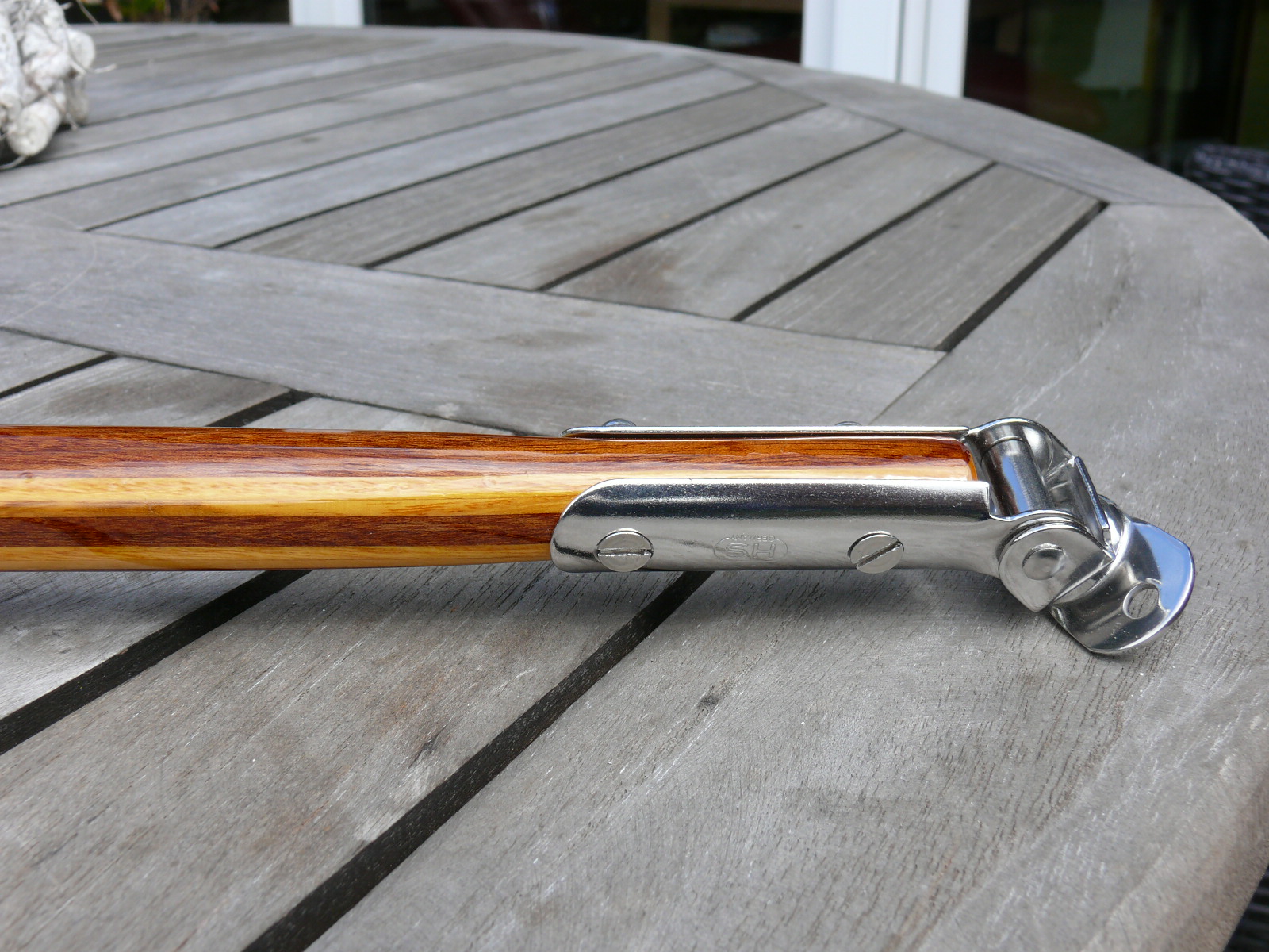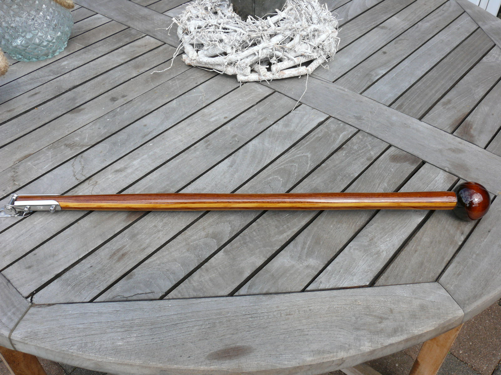 neben meinen Pinnen biete ich nun auch handgefertigte "Edelpinnenausleger" aus 2,5 mm Mahagoni- und Esche- Starkfurnieren an. Die Furniere werden mit Epoxidharz verklebt und nicht mit Leim, was deutlich dauerhaltbarer ist. Am Kopf wird eine mahagonifarbige Holzkugel im Durchmesser von 5 cm aufgesetzt. Diese Ausleger werden in Einzelanfertigung nach Wunsch des Bestellers von mir angefertigt. Die Länge kann nach Wunsch gefertigt werden, auch gebogene Formen sind möglich. Der Pinnenauslegerbeschlag kommt von der Fa. Sprenger, ist komplett aus VA-Stahl und hat eine 19 mm Aufnahme.