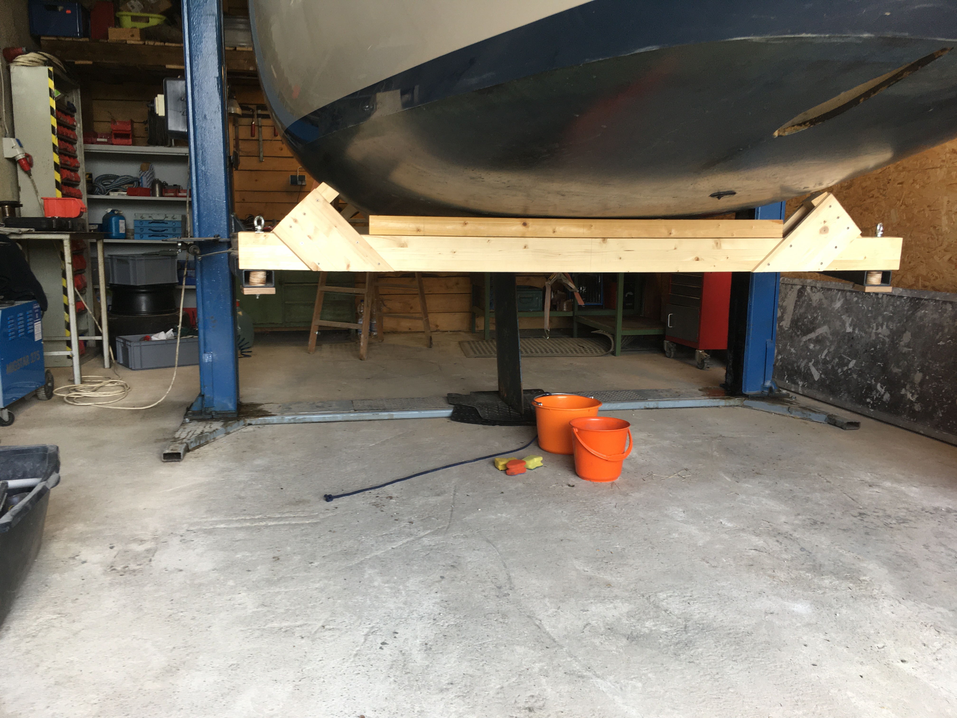 Ich habe eine KFZ Hebebühne genutzt. Ich habe mir zwei Traversen aus Leimholz angefertigt, die ich vorne und hinten, quer über die Ausleger der Hebebühne gelegt habe. Diese wurden auf den Auslegern gegen Verrutschen gesichert. Hat super funktioniert! Die Hebebühne kann man sehr gut dosiert hoch und runter fahren, so das der Kielausbau gut funktioniert.