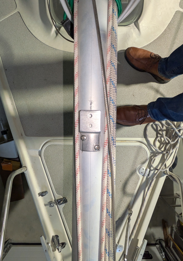 - Decksduchführungen: In der Nähe vom Mastfuß hat mutmaßlich der Vor-Vor-Vorbesitzer oder der Hersteller bereits Decksdurchführungen montiert, aber diese sind weder innen angeschlossen noch sind Leitungen im Mast weitergeführt. Siehe Bild 1. Die Decksdurchführungen sind auch nur außen sichtbar, nicht innen. Nach mehrfachem Nachmessen bin ich überzeugt, dass diese Decksdurchführungen innen innerhalb des Kastens für den Hubkiel enden. Durch das Inspektionsloch im Kielkastens kann ich aber nichts erkennen.