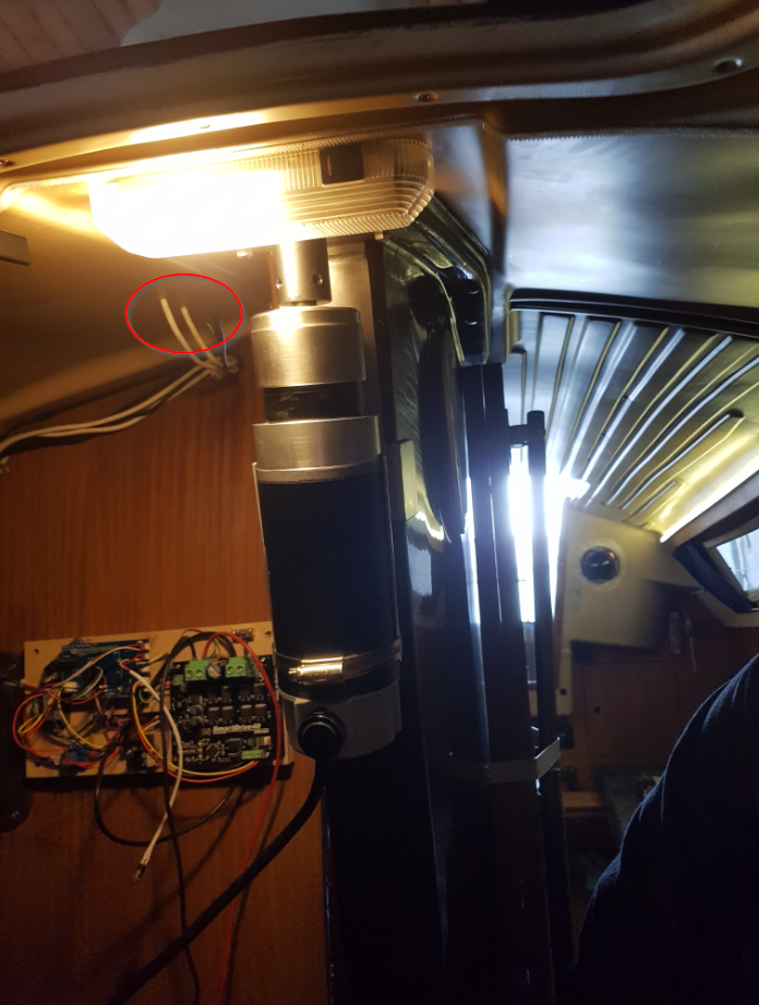 Die 12V Kabel verläuft dabei im inneren des Bootes in einem Wellrohr, welches an Steuerbord zwischen dem Himmel und der Bordwand eingeklemmt wird.