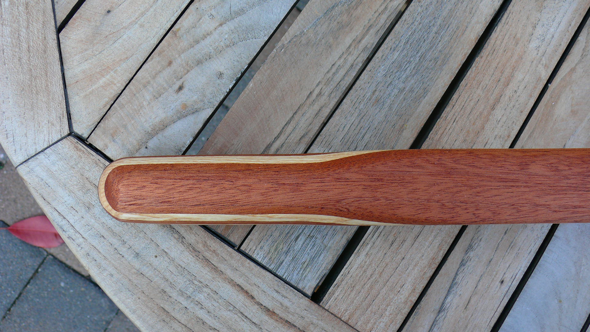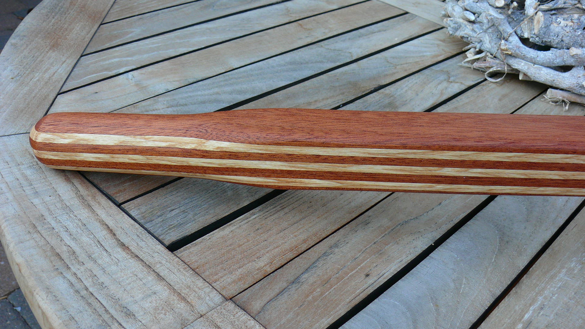 Passendes Material habe ich seit heute vorliegen für den Bau von ca 10 Pinnen. Ich war heute beruflich in der Nähe von Ahlen und bin direkt bei der Bicker-Werft, die die legendären Biga`s baut, vorbeigekommen. Ich habe spontan gehalten und habe nun eine Mahagonibohle und eine Eschebohle, gut getrocknet im Mass 98 cm lang x 5,2 cm dick, ca 50 cm breit bei mir im Kofferraum liegen.
